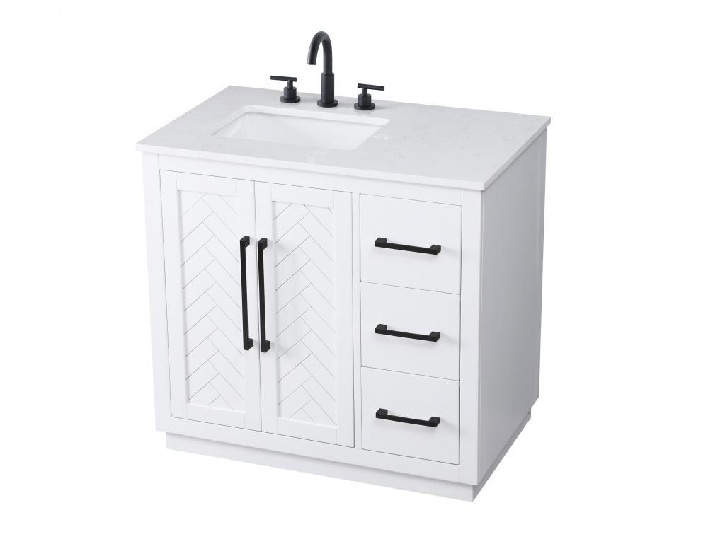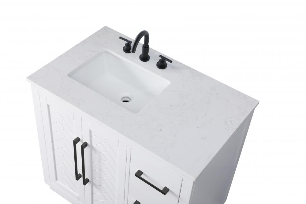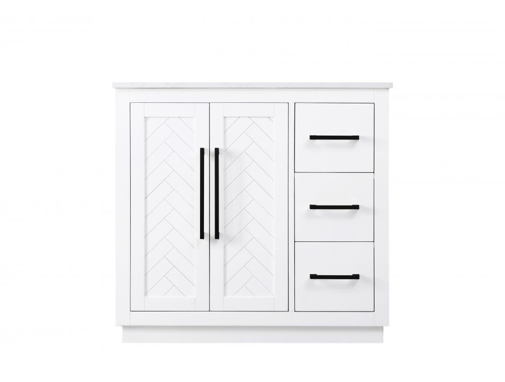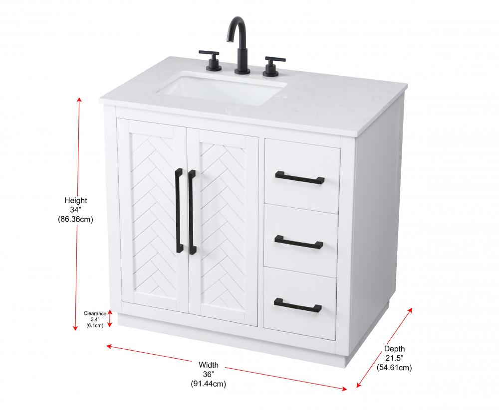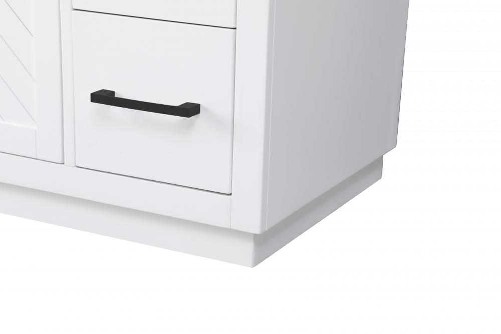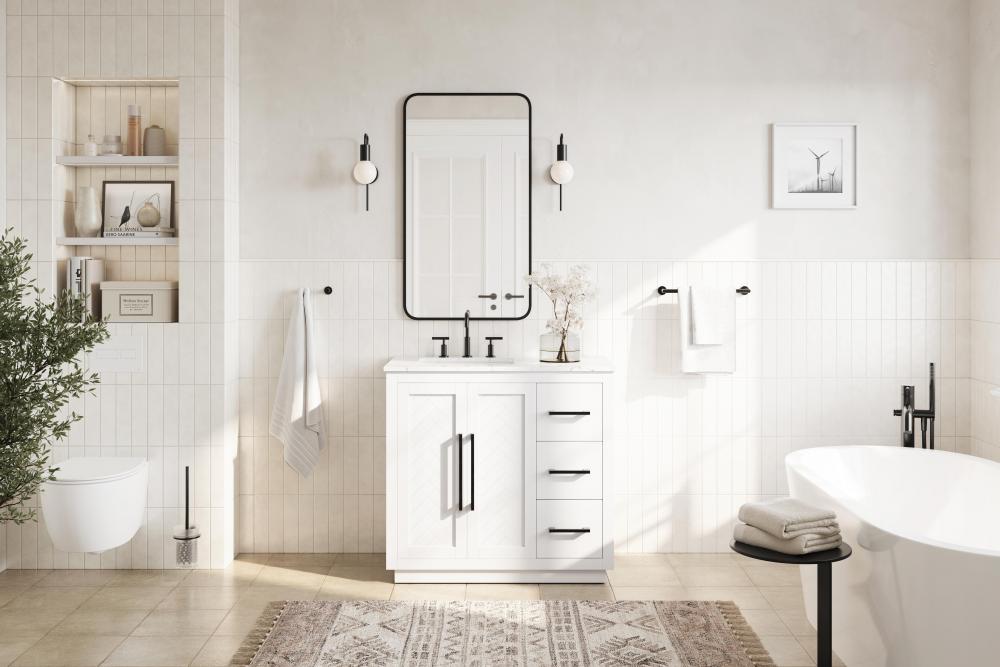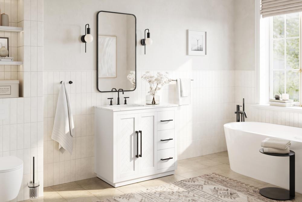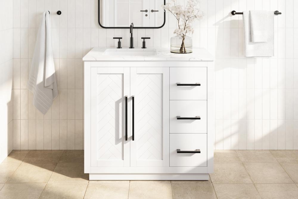 This transitional bathroom vanity offers the perfect blend of timeless style and modern functionality. Available in five refined finishes—crisp white, sleek grey, chocolate oak, honey oak, and linen oak—it complements a range of decor styles, from classic to contemporary. The stunning herringbone design on the Shaker-style door panels adds texture and craftsmanship to the piece. Topped with a white engineered marble countertop featuring subtle veining, it provides both beauty and durability. The long black metal pulls on the soft-closing doors and the thin bar pulls on the drawers add sleek, modern detailing. Practical features include a concealed overflow, a back panel cutout for easy plumbing installation, and a U-shaped cutout shelf to fit plumbing while maximizing storage space. with a toe kick all around the base, this vanity is thoughtfully designed to blend form and function in any bathroom setting.