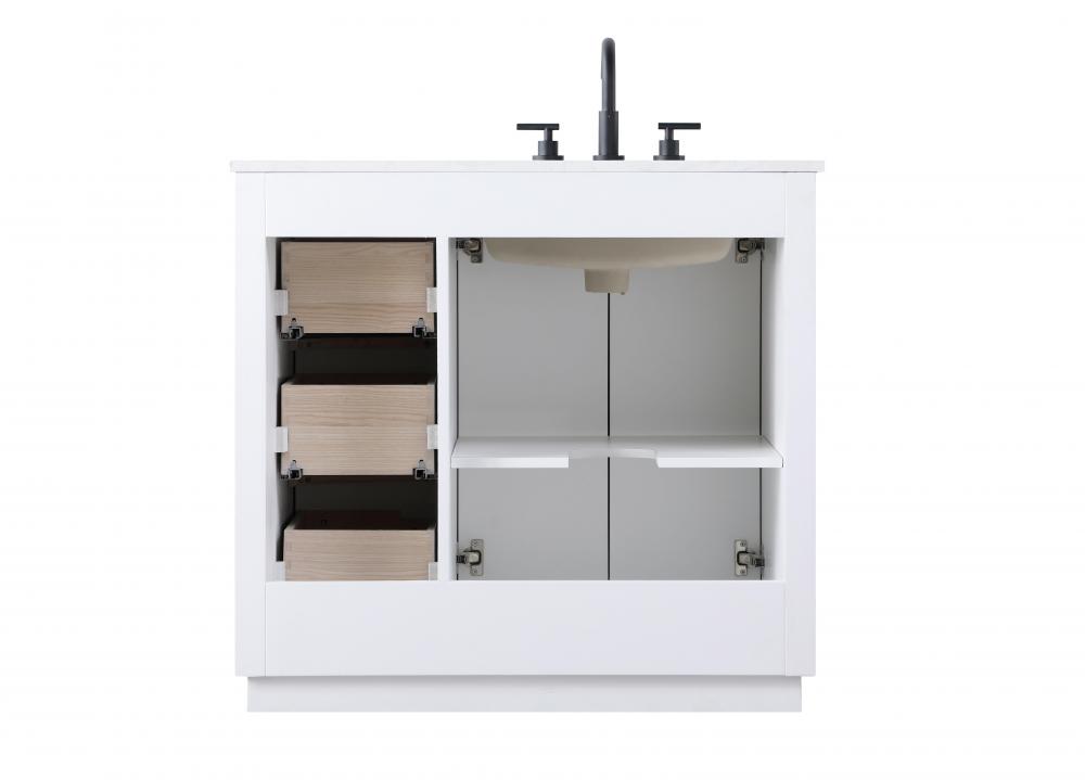 The vanity is topped with a white engineered marble countertop featuring subtle, natural-looking veining that creates a luxurious yet low-maintenance surface. This countertop adds elegance while providing durability, making it ideal for everyday use.