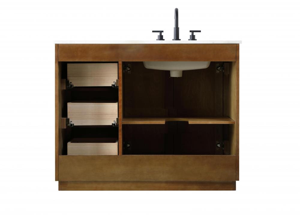 The vanity is topped with a white engineered marble countertop featuring subtle, natural-looking veining that creates a luxurious yet low-maintenance surface. This countertop adds elegance while providing durability, making it ideal for everyday use.