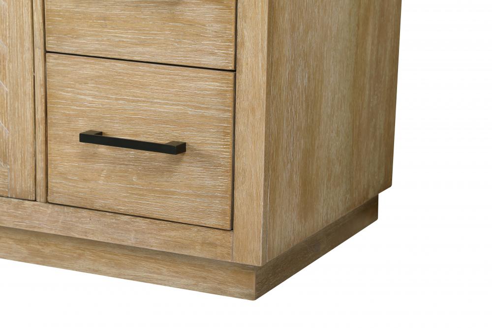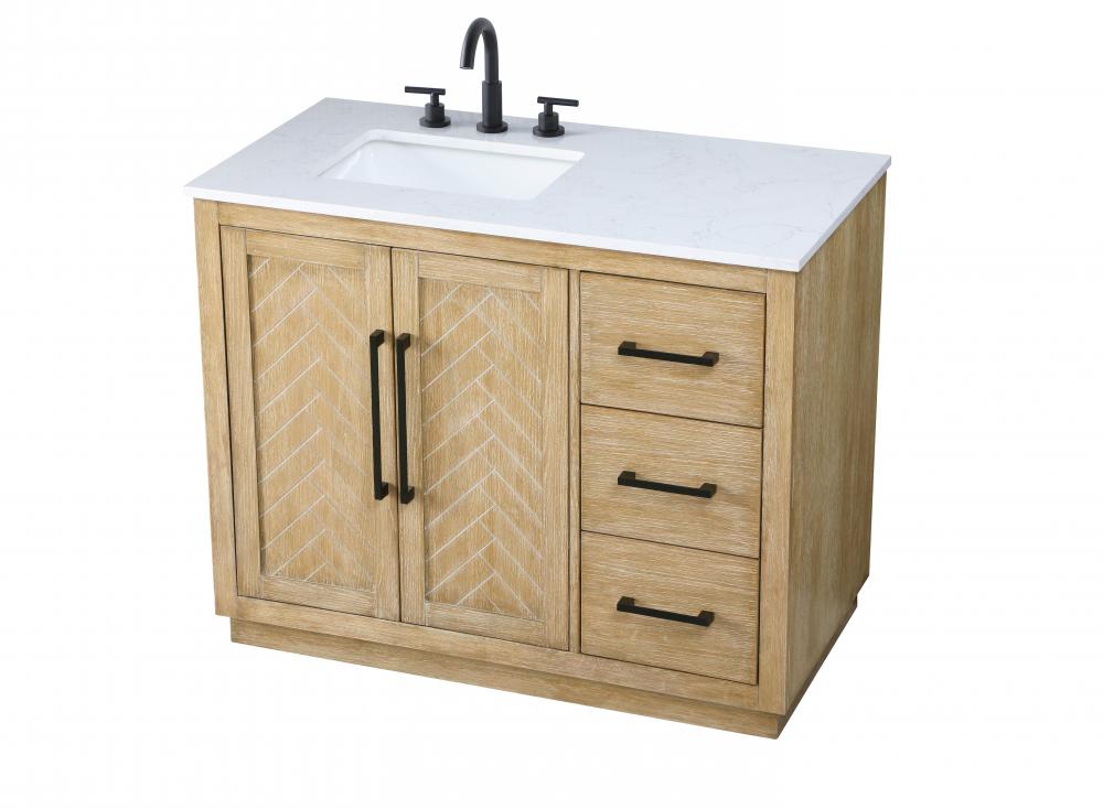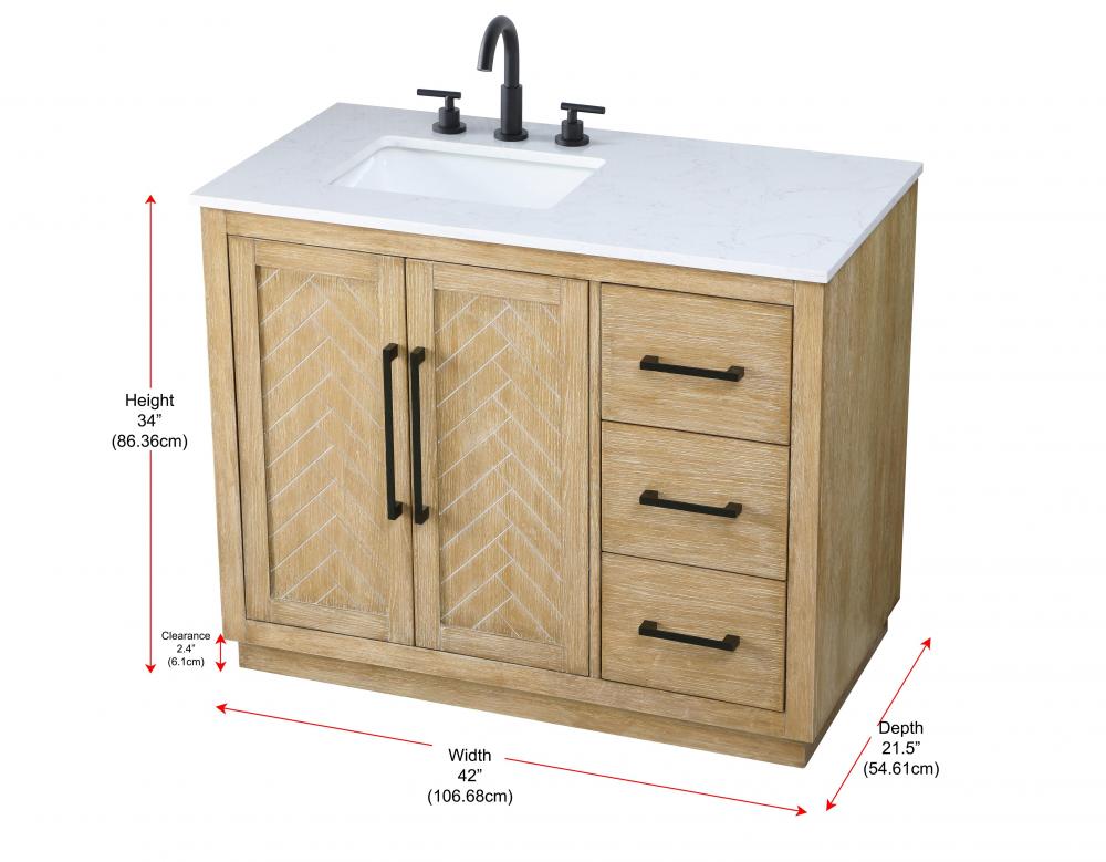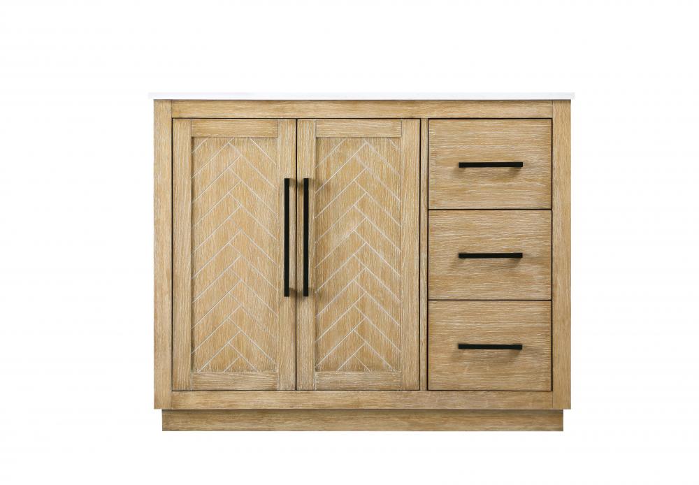 This transitional bathroom vanity offers the perfect blend of timeless style and modern functionality. Available in five refined finishes—crisp white, sleek grey, chocolate oak, honey oak, and linen oak—it complements a range of decor styles, from classic to contemporary. The stunning herringbone design on the Shaker-style door panels adds texture and craftsmanship to the piece. Topped with a white engineered marble countertop featuring subtle veining, it provides both beauty and durability. The long black metal pulls on the soft-closing doors and the thin bar pulls on the drawers add sleek, modern detailing. Practical features include a concealed overflow, a back panel cutout for easy plumbing installation, and a U-shaped cutout shelf to fit plumbing while maximizing storage space. with a toe kick all around the base, this vanity is thoughtfully designed to blend form and function in any bathroom setting.