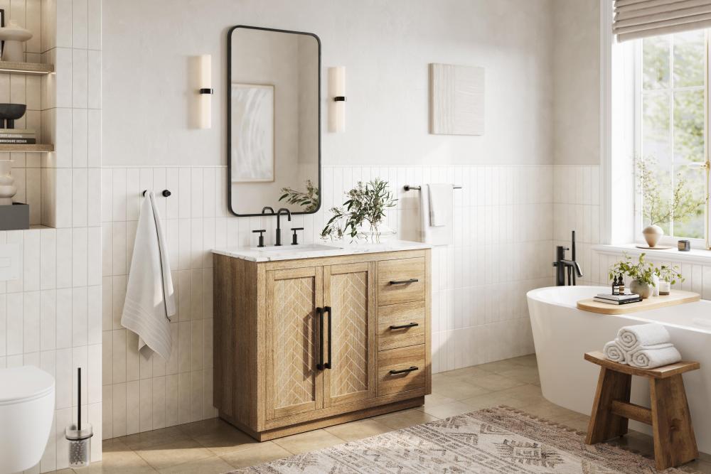 Each finish enhances the unique herringbone design on the Shaker-style door panels, adding a touch of craftsmanship and texture that elevates the overall design of the vanity.