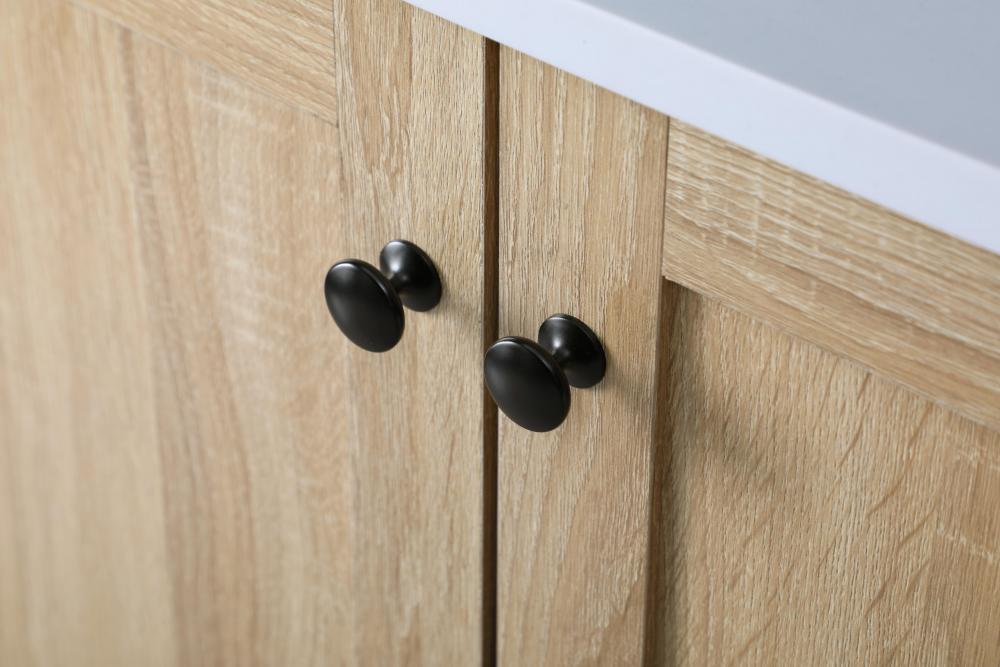 Experience the seamless and quiet operation of soft-closing four drawers and doors adorned with high-quality decorative knobs and slender bar pulls, adding a touch of sophistication.