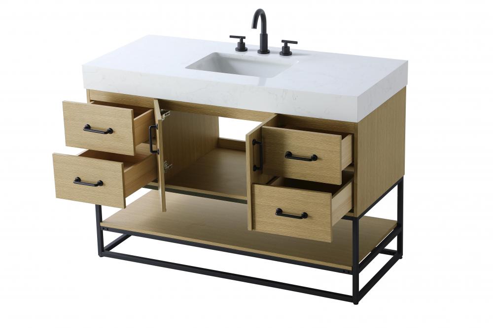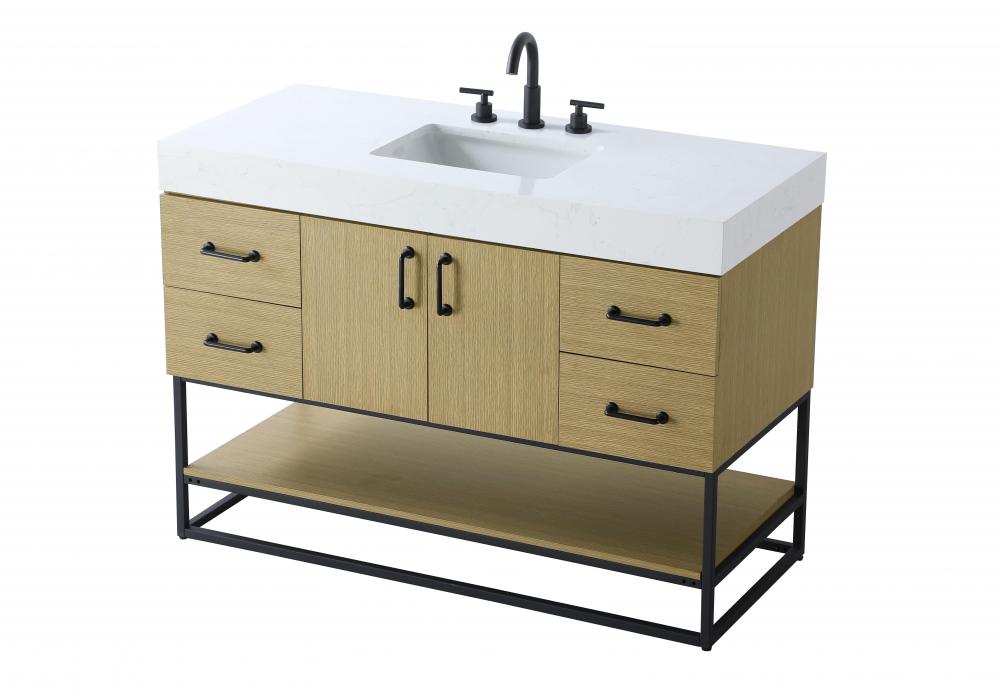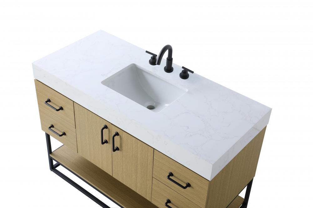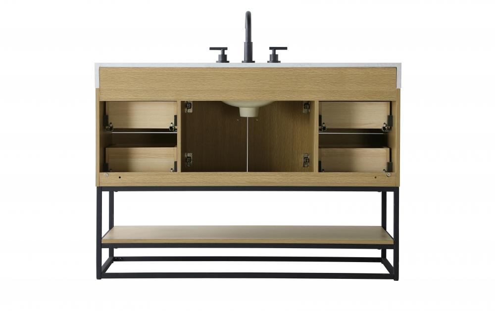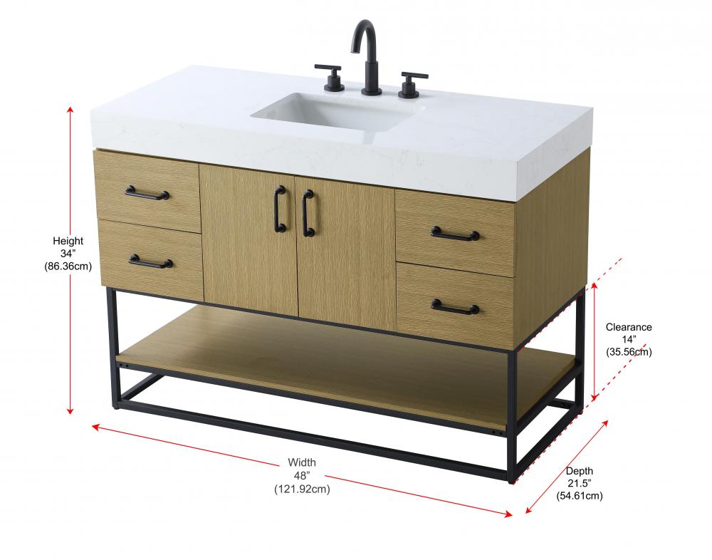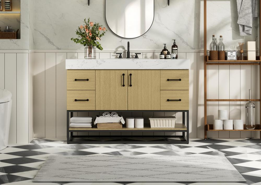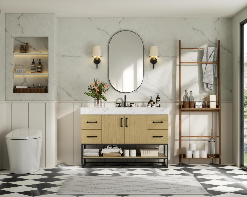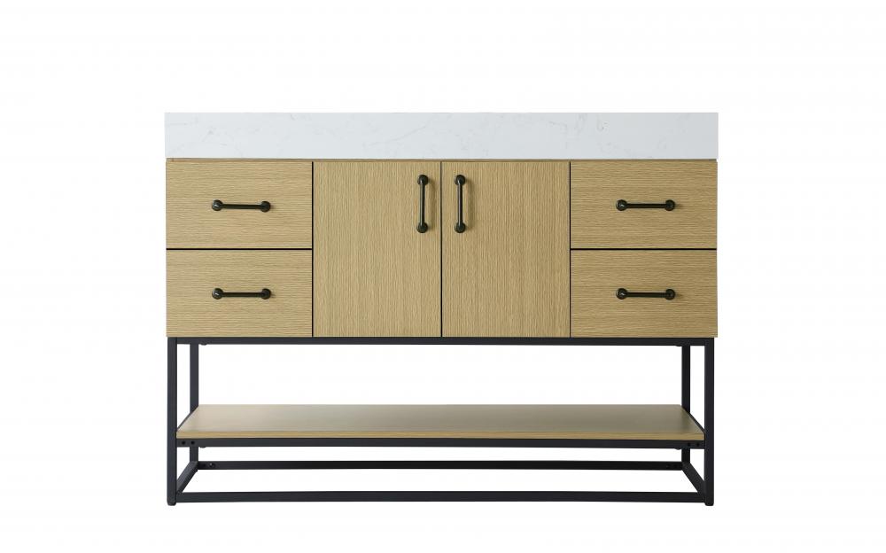 Upgrade your bathroom with this stylish transitional vanity, available in five stunning finishes, from crisp white to warm honey brown, designed to suit a variety of decor styles. The minimalist flat door panels and open wood shelf create a functional yet visually appealing storage solution, while the slender black metal legs elevate the look with modern sophistication. The 4-inch thick white engineered marble countertop, accented with natural veining, adds a luxurious touch, perfectly complemented by soft-closing doors with sleek black metal bar pulls. Thoughtful details like the concealed overflow, back panel cutout for plumbing, and 3 pre-drilled holes for an 8-inch faucet make installation easy and efficient. with a porcelain sink and farmhouse-inspired touches, this vanity brings both elegance and practicality to any bathroom setting.