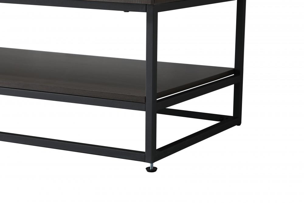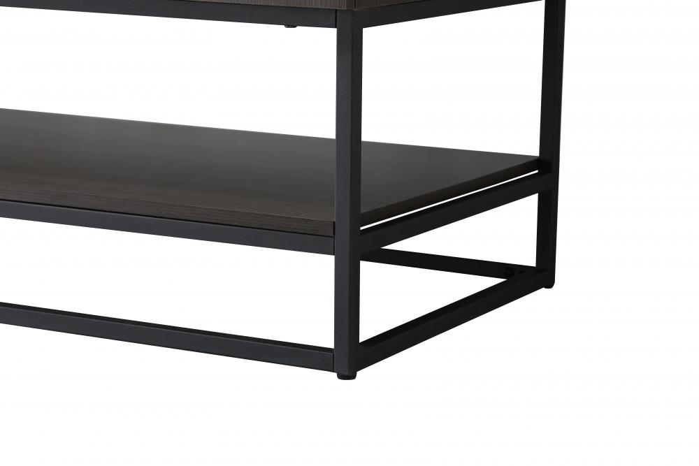 A matching open wood shelf at the bottom provides ample space for storage and decor, supported by slender black metal legs with a 14-inch clearance, combining both practical function and a contemporary edge.