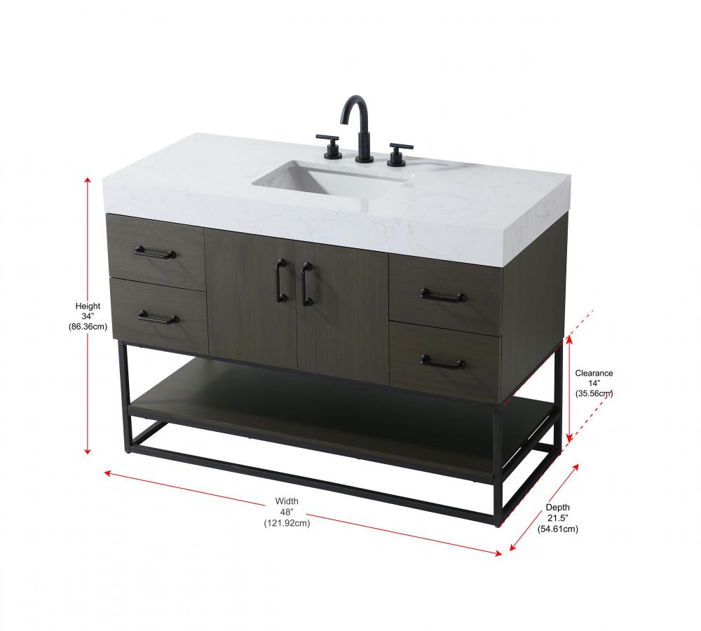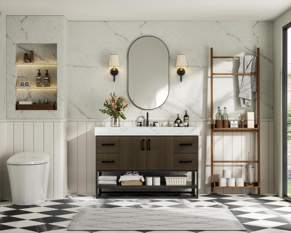 Upgrade your bathroom with this stylish transitional vanity, available in five stunning finishes, from crisp white to warm honey brown, designed to suit a variety of decor styles. The minimalist flat door panels and open wood shelf create a functional yet visually appealing storage solution, while the slender black metal legs elevate the look with modern sophistication. The 4-inch thick white engineered marble countertop, accented with natural veining, adds a luxurious touch, perfectly complemented by soft-closing doors with sleek black metal bar pulls. Thoughtful details like the concealed overflow, back panel cutout for plumbing, and 3 pre-drilled holes for an 8-inch faucet make installation easy and efficient. with a porcelain sink and farmhouse-inspired touches, this vanity brings both elegance and practicality to any bathroom setting.