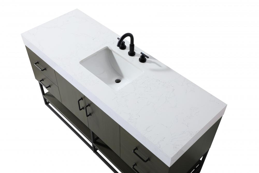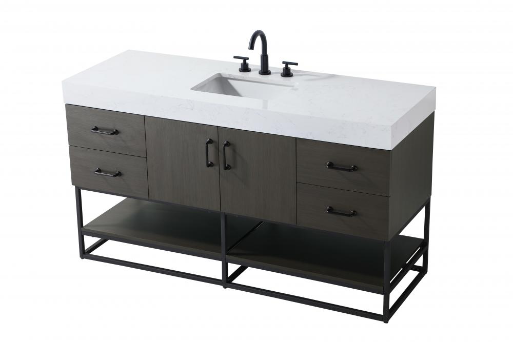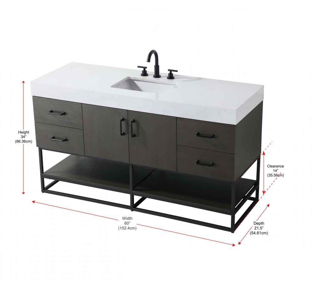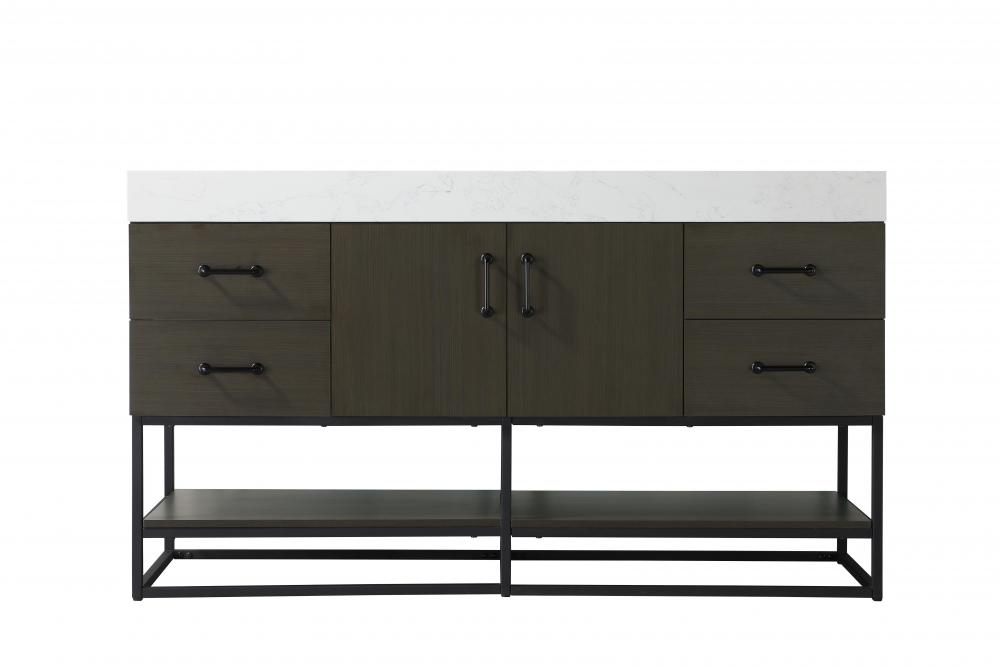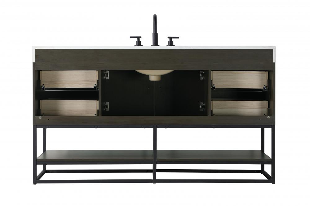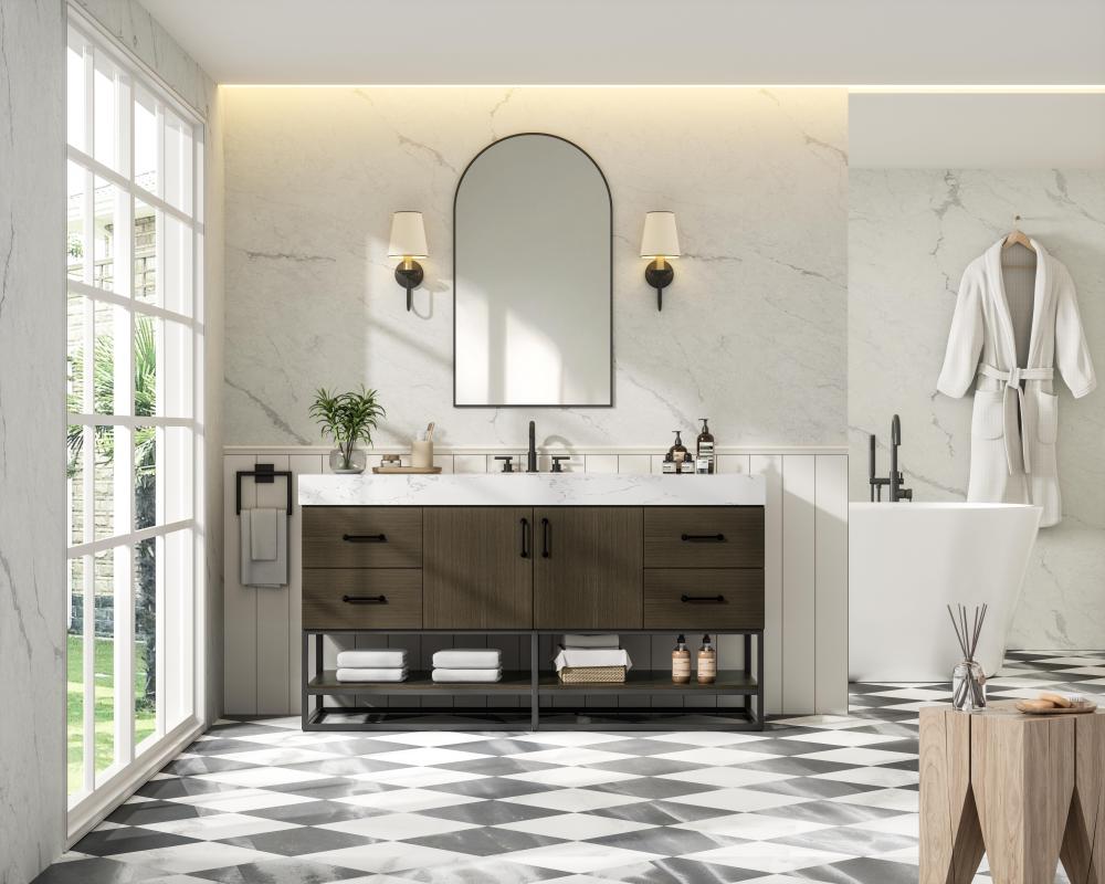 Upgrade your bathroom with this stylish transitional vanity, available in five stunning finishes, from crisp white to warm honey brown, designed to suit a variety of decor styles. The minimalist flat door panels and open wood shelf create a functional yet visually appealing storage solution, while the slender black metal legs elevate the look with modern sophistication. The 4-inch thick white engineered marble countertop, accented with natural veining, adds a luxurious touch, perfectly complemented by soft-closing doors with sleek black metal bar pulls. Thoughtful details like the concealed overflow, back panel cutout for plumbing, and 3 pre-drilled holes for an 8-inch faucet make installation easy and efficient. with a porcelain sink and farmhouse-inspired touches, this vanity brings both elegance and practicality to any bathroom setting.
