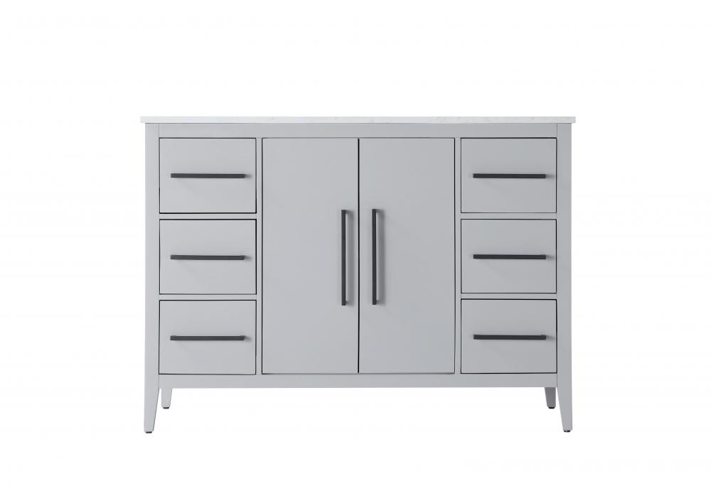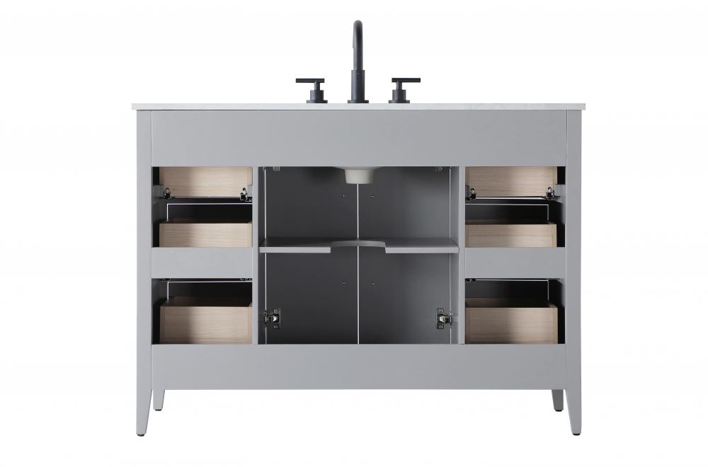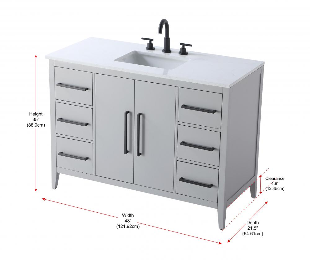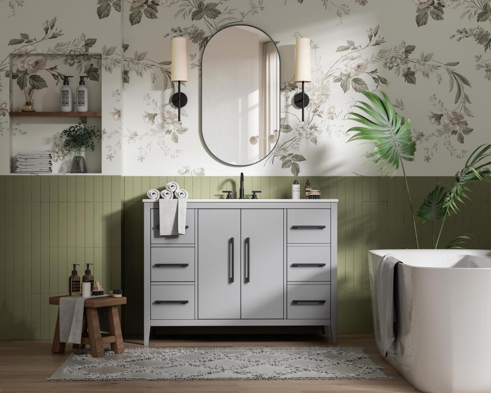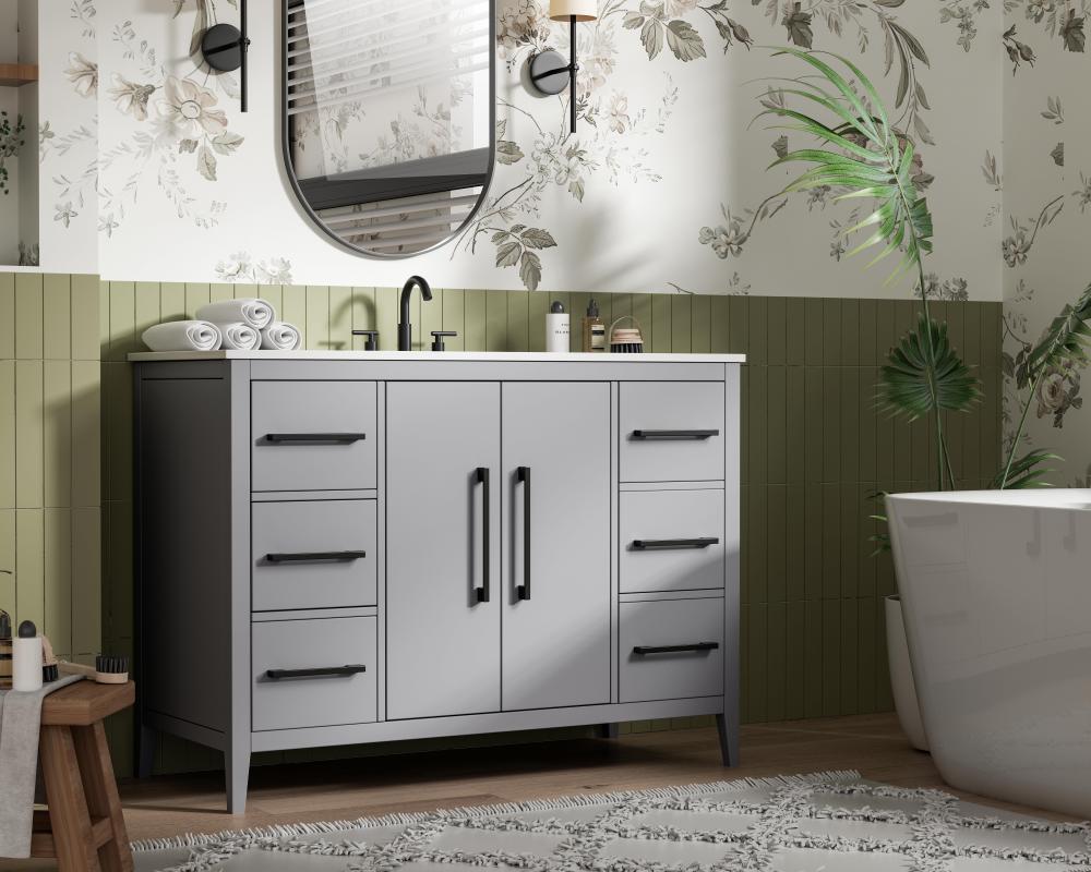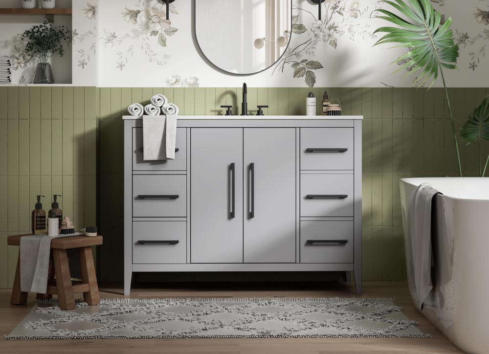 The vanity stands on tapered 5-inch solid wood legs with levelers for a balanced, polished look, combining modern style with practicality.