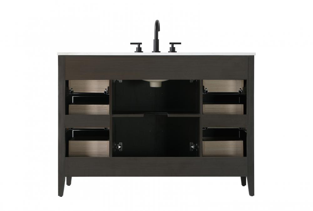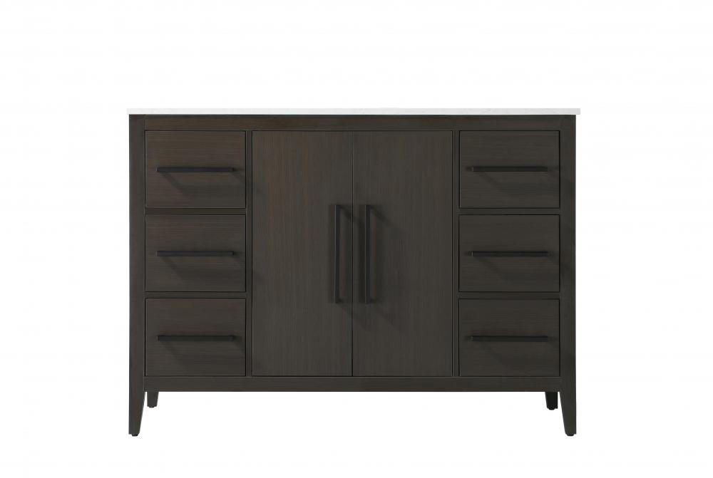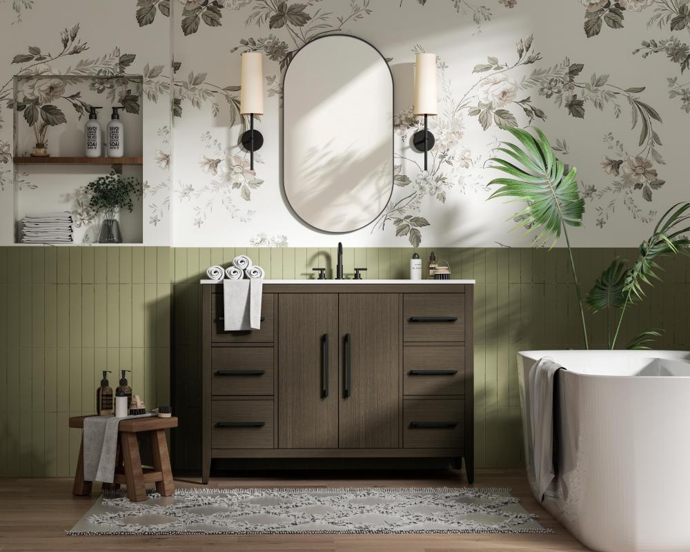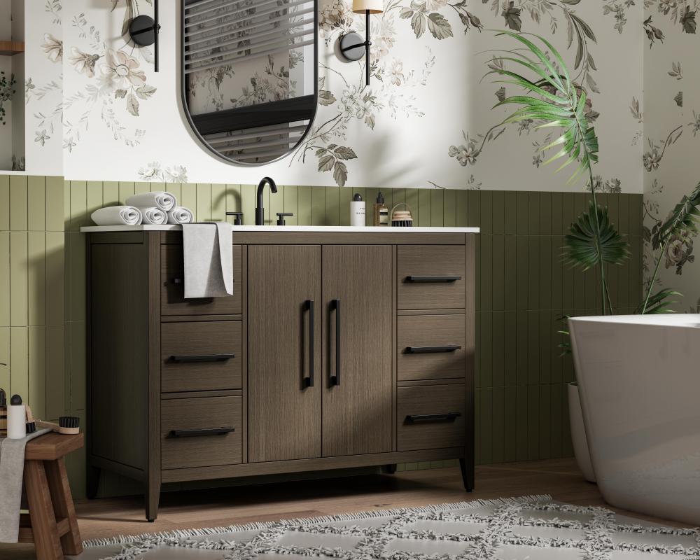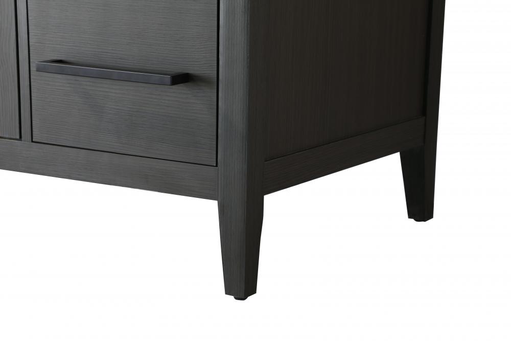 The vanity stands on tapered 5-inch solid wood legs with levelers for a balanced, polished look, combining modern style with practicality.