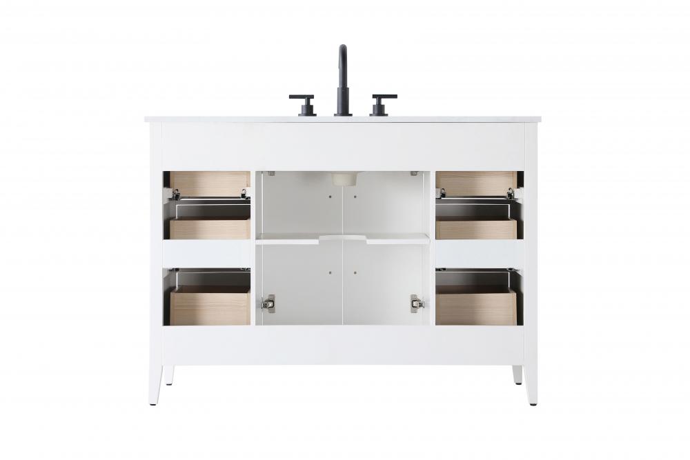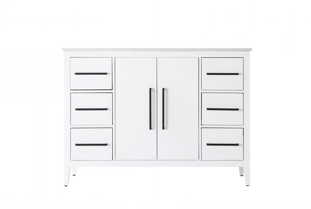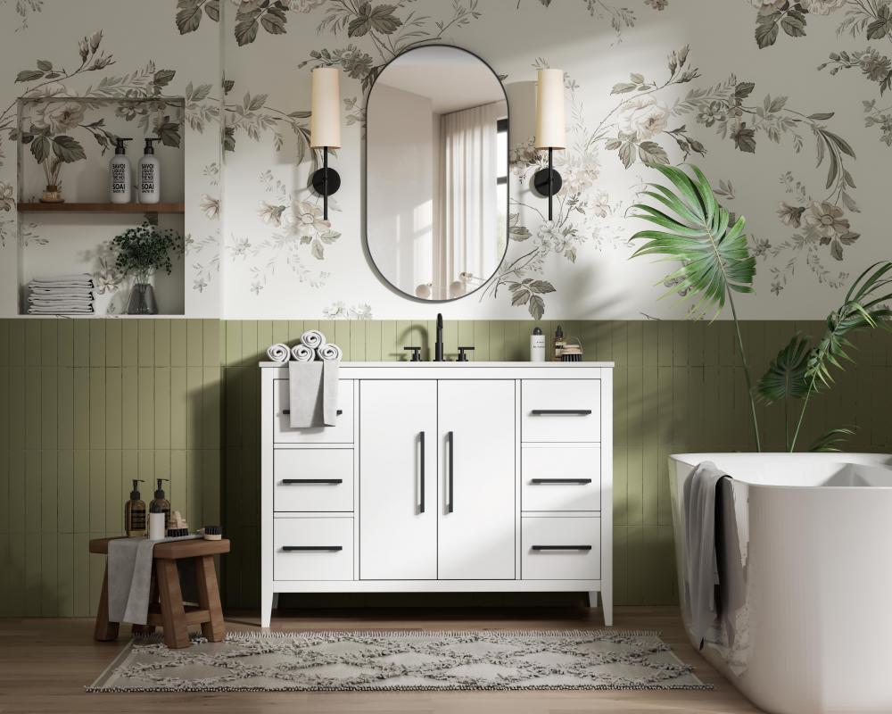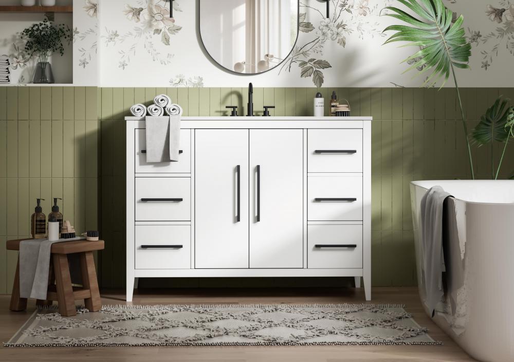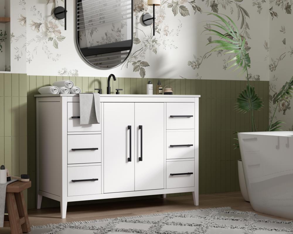 Bring both elegance and practicality to your bathroom with this transitional vanity, available in a selection of rich finishes that highlight the beauty of faux wood grain in shades of mocha, chestnut, and honey, along with classic white and modern grey. The flat door panels and sleek black metal pulls create a minimalist yet refined aesthetic, while the soft-closing drawers and tapered legs with levelers provide smooth, functional operation. Topped with a luxurious white engineered marble countertop and featuring a porcelain sink, this vanity combines timeless style with modern efficiency. Thoughtfully designed with U-shaped cutout for plumbing, it offers ample storage and easy installation, making it the perfect centerpiece for any bathroom.