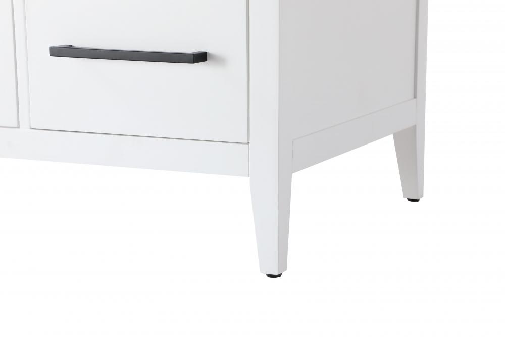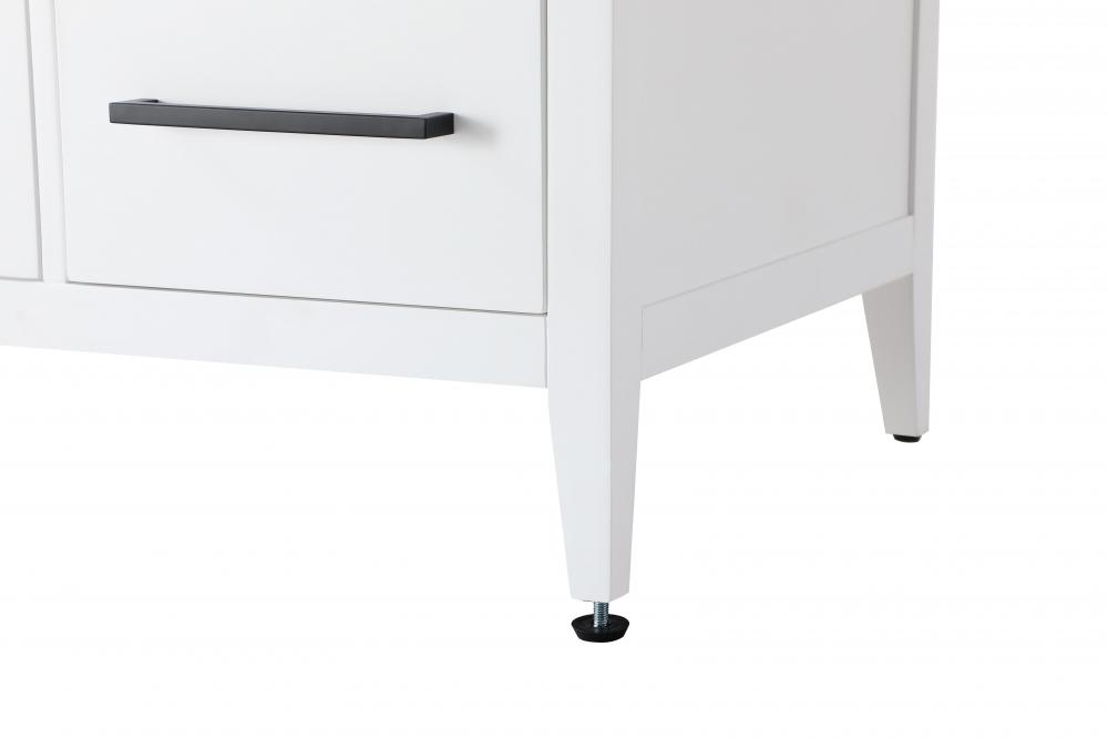 The vanity stands on tapered 5-inch solid wood legs with levelers for a balanced, polished look, combining modern style with practicality.