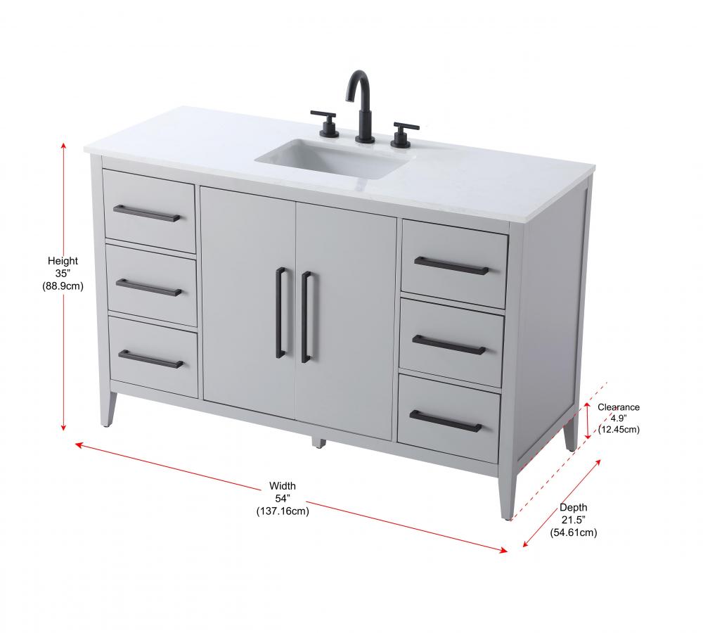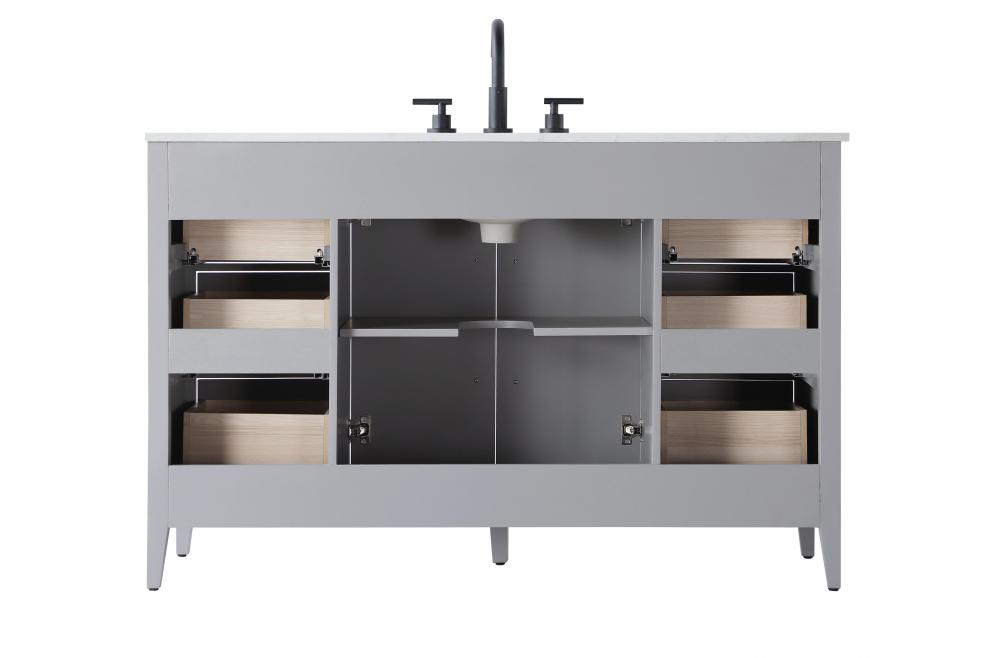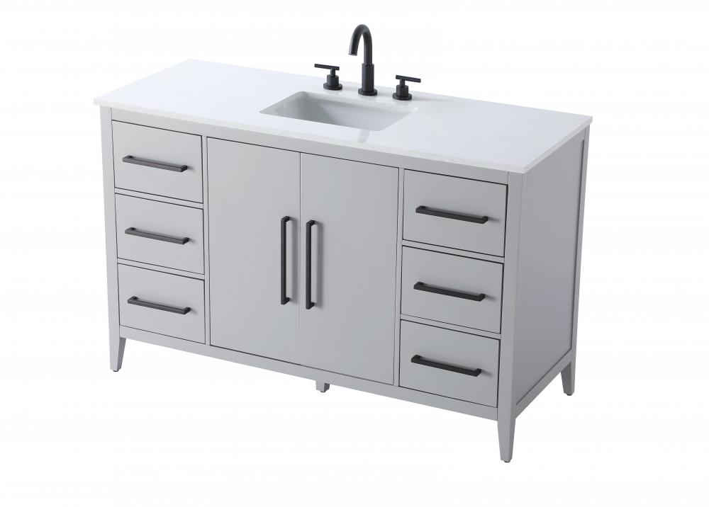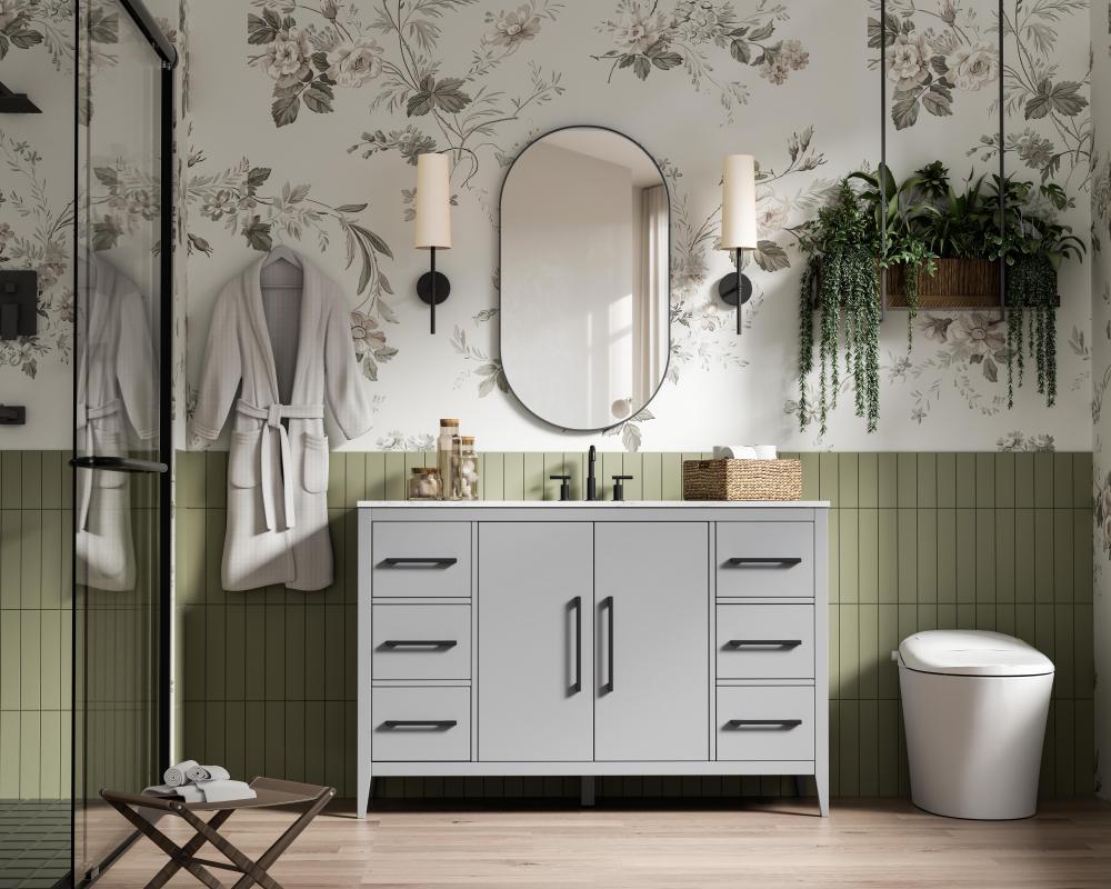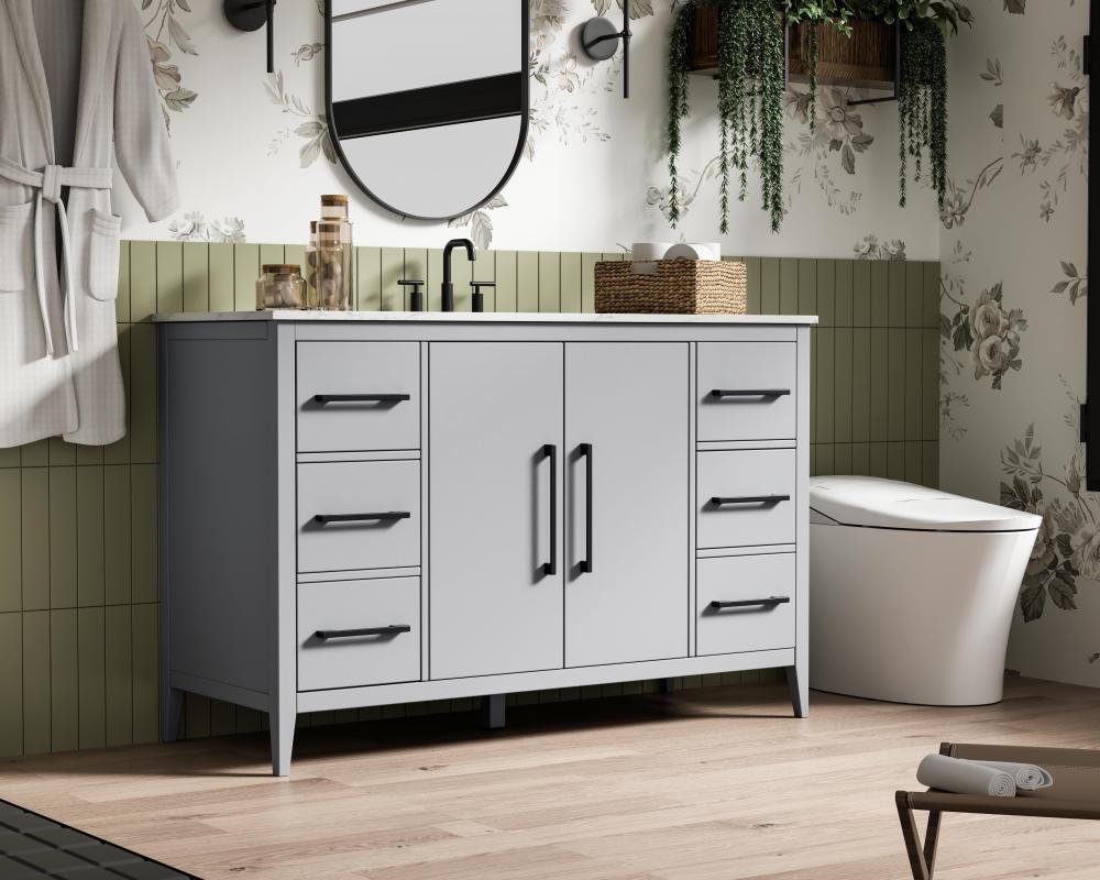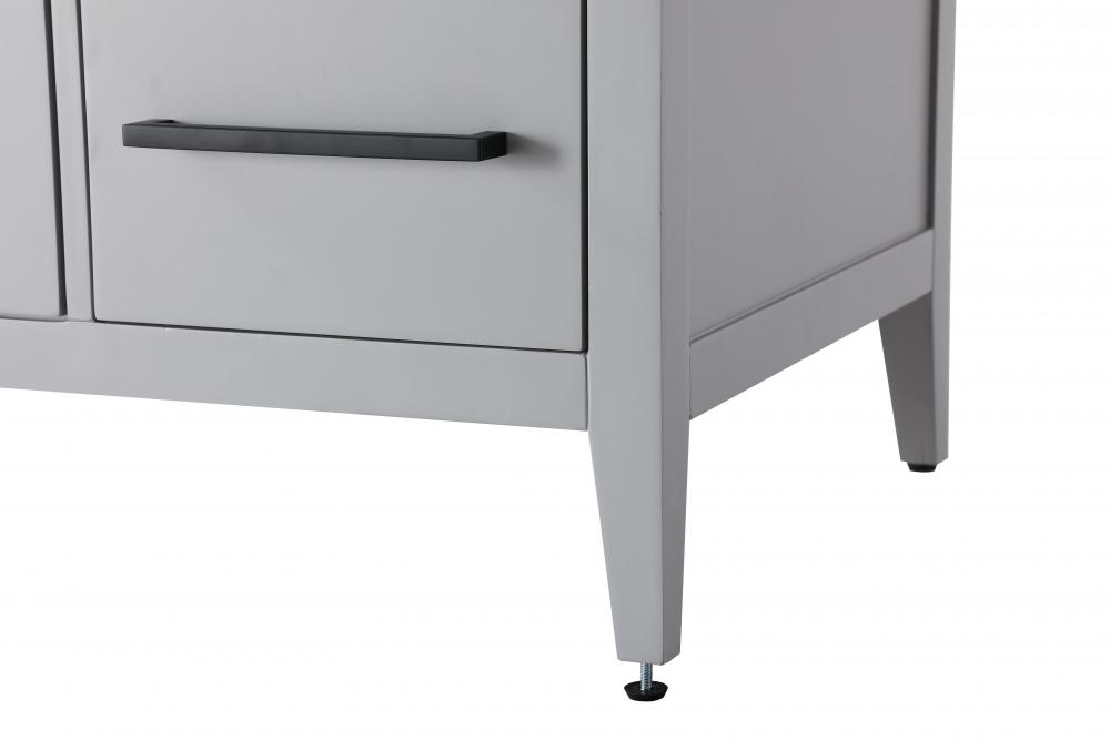 The vanity stands on tapered 5-inch solid wood legs with levelers for a balanced, polished look, combining modern style with practicality.
