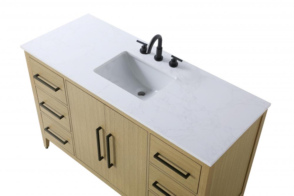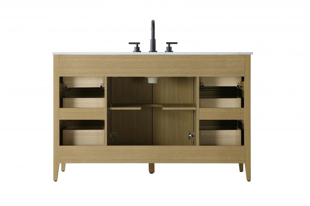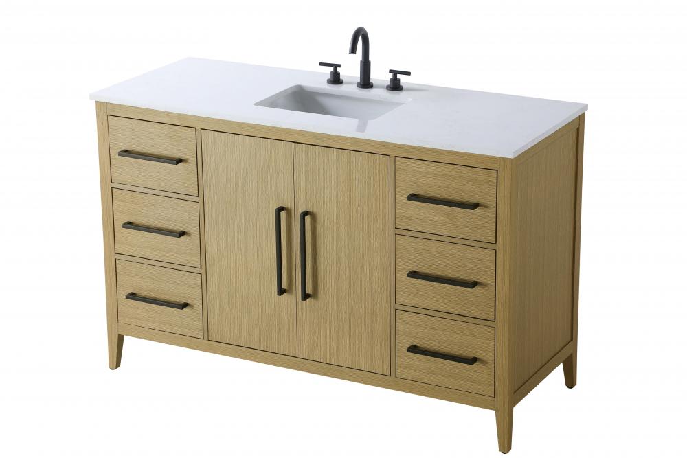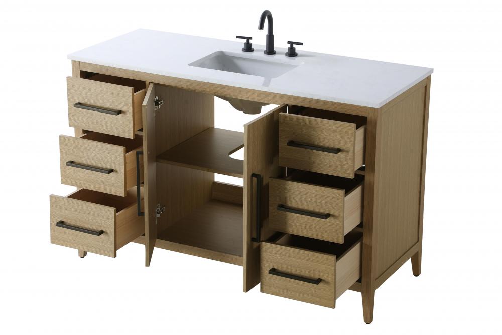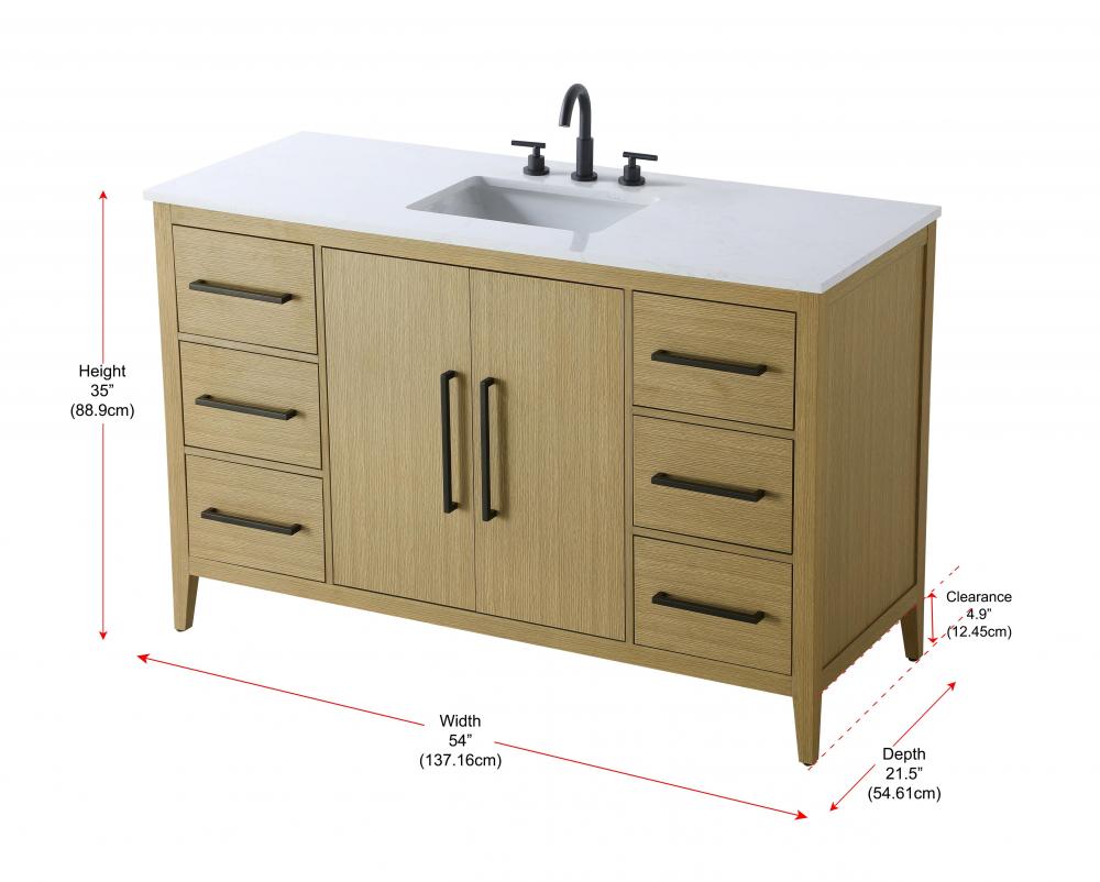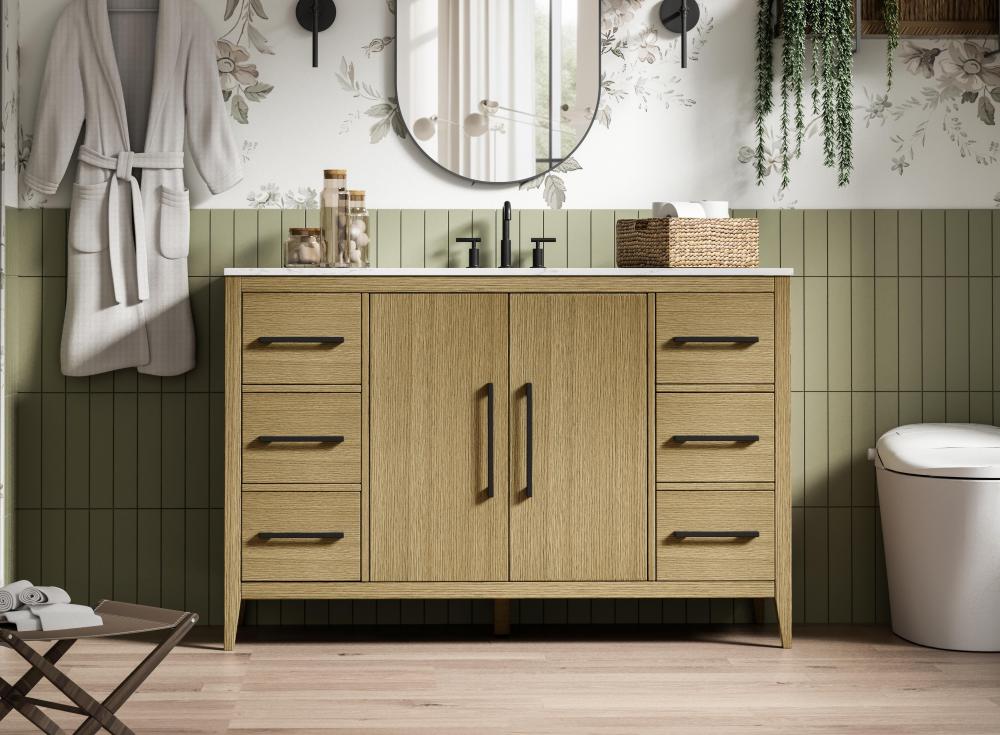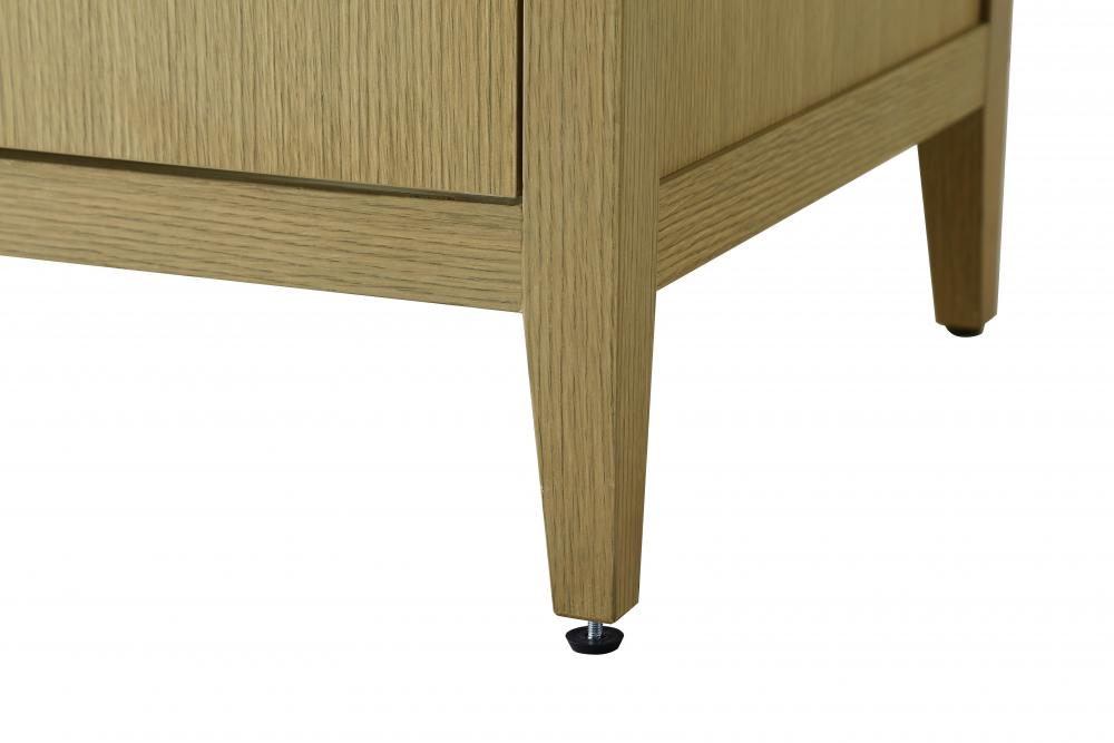 The vanity stands on tapered 5-inch solid wood legs with levelers for a balanced, polished look, combining modern style with practicality.