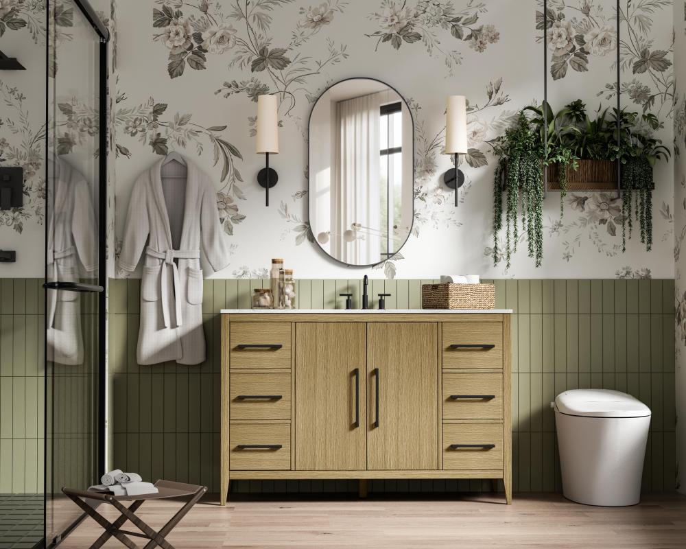 The minimalist flat door panels create a sleek, modern appearance, perfect for blending into transitional and contemporary bathroom designs.