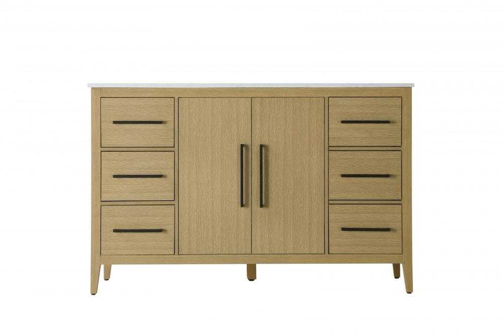 Bring both elegance and practicality to your bathroom with this transitional vanity, available in a selection of rich finishes that highlight the beauty of faux wood grain in shades of mocha, chestnut, and honey, along with classic white and modern grey. The flat door panels and sleek black metal pulls create a minimalist yet refined aesthetic, while the soft-closing drawers and tapered legs with levelers provide smooth, functional operation. Topped with a luxurious white engineered marble countertop and featuring a porcelain sink, this vanity combines timeless style with modern efficiency. Thoughtfully designed with U-shaped cutout for plumbing, it offers ample storage and easy installation, making it the perfect centerpiece for any bathroom.