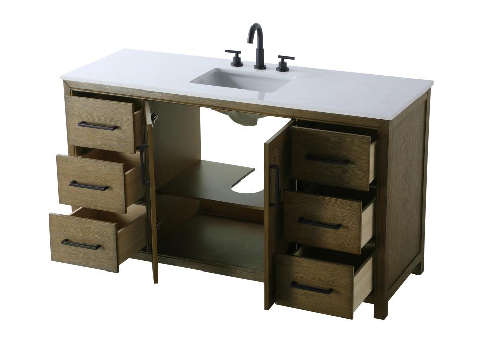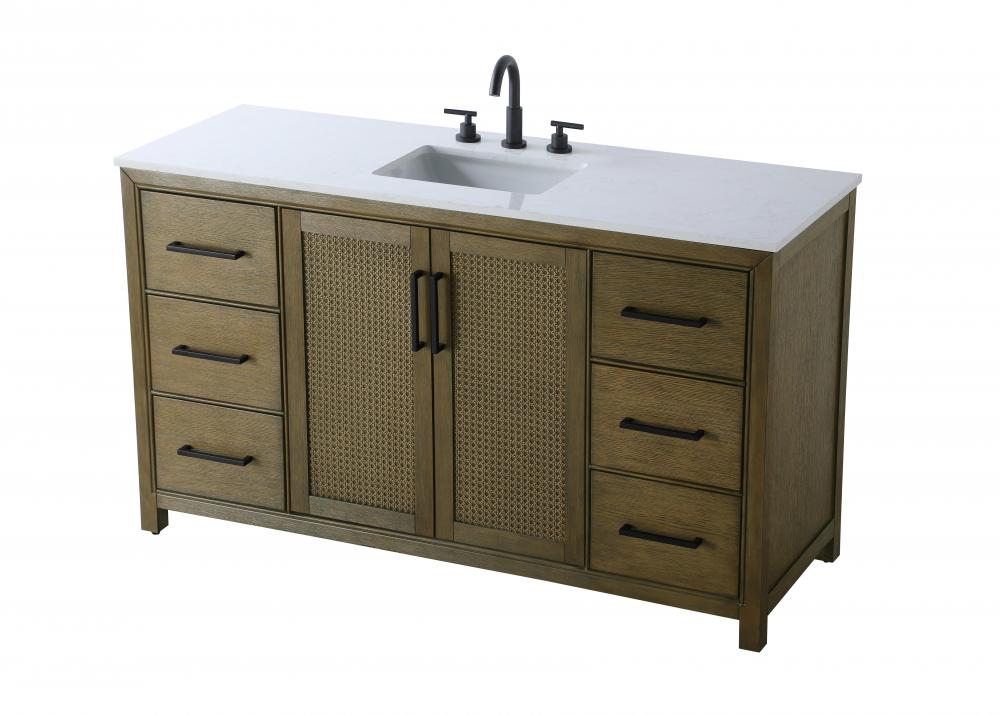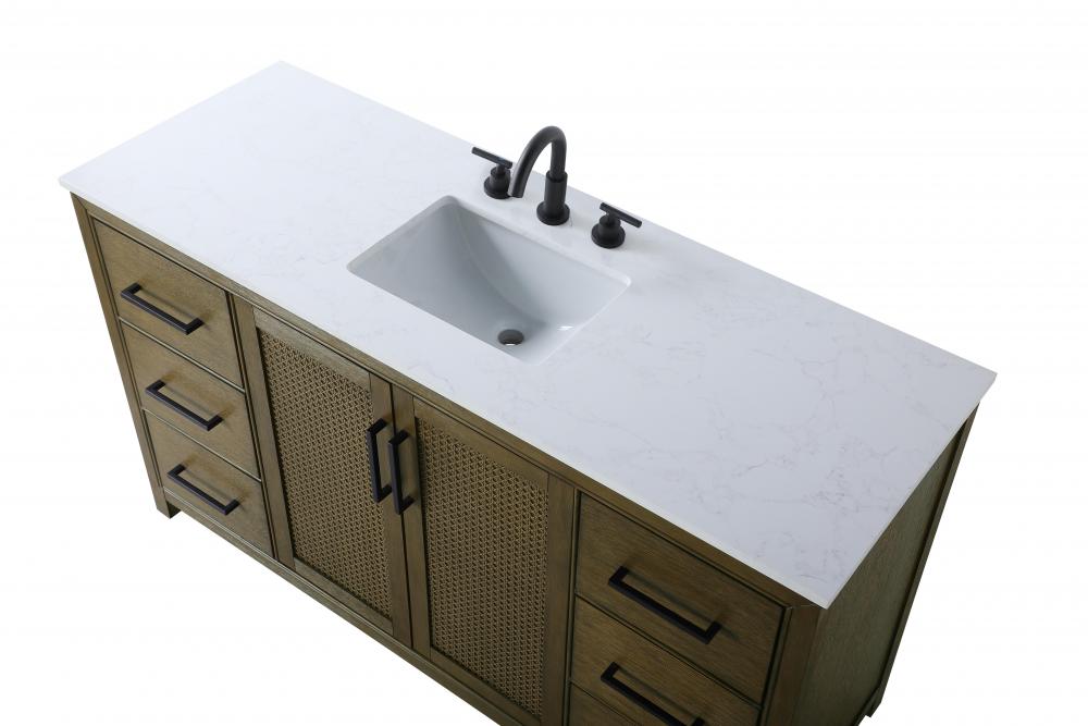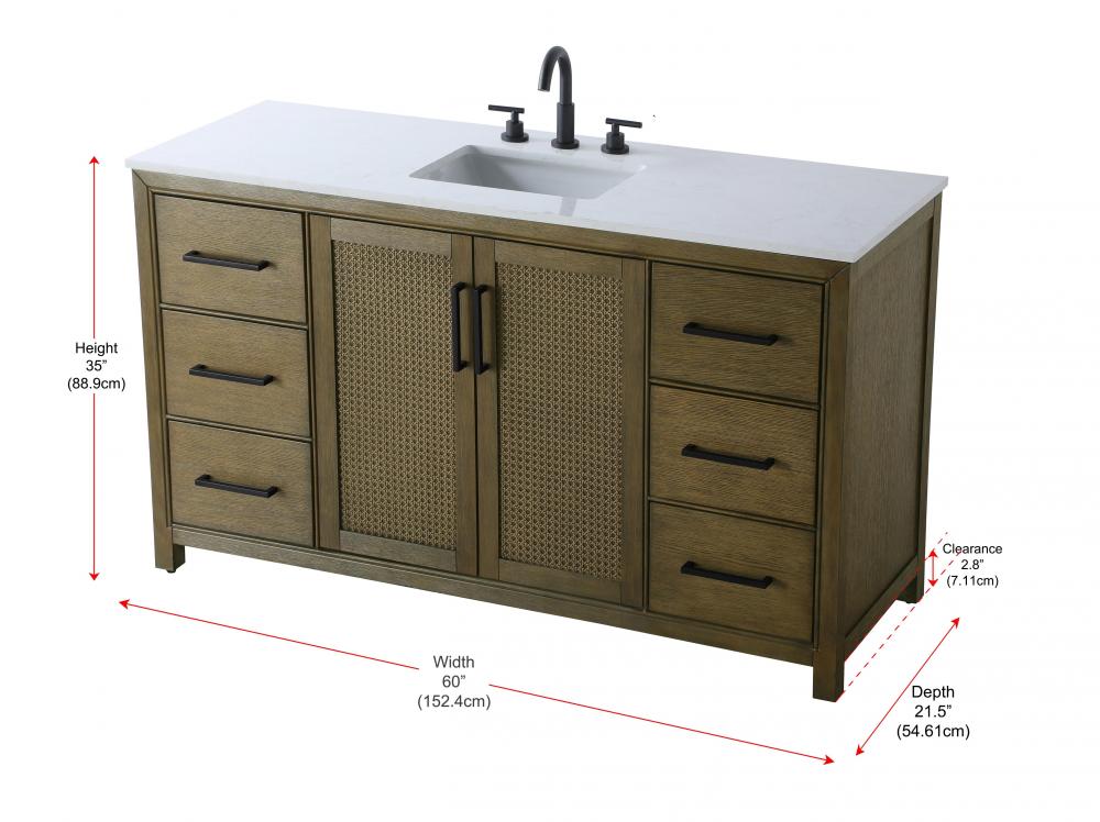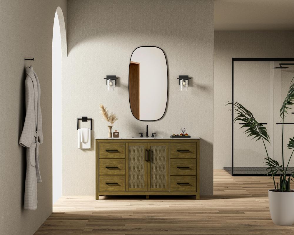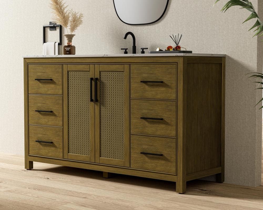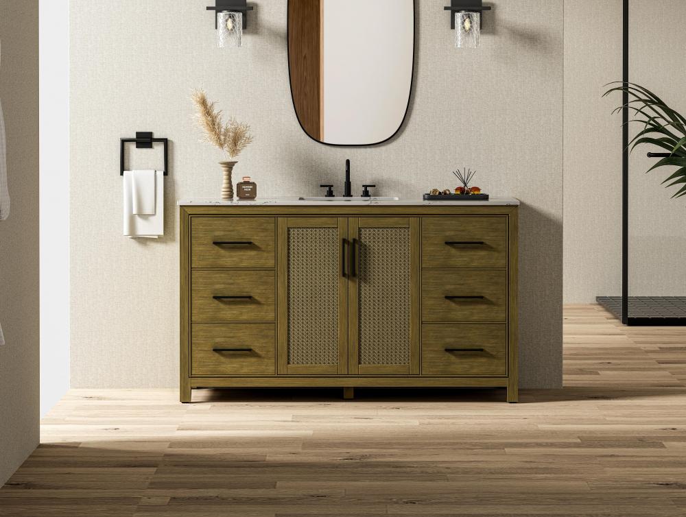 Perfect for those with an eye for detail and quality, this transitional vanity blends modern design with timeless elegance. Available in five stunning finishes, from Crisp White to Linen Oak, the wood grain visuals of the oak options bring warmth and character to any bathroom. The caning design on the Shaker-style door panels adds texture and a touch of refinement, while the soft-closing doors and drawers ensure smooth, quiet functionality. Topped with a white engineered marble countertop, the vanity offers both luxury and practicality, complete with pre-drilled faucet holes for customization. A concealed overflow and U-shaped shelf for plumbing make installation effortless, and the slender black metal pulls provide a sleek contrast.