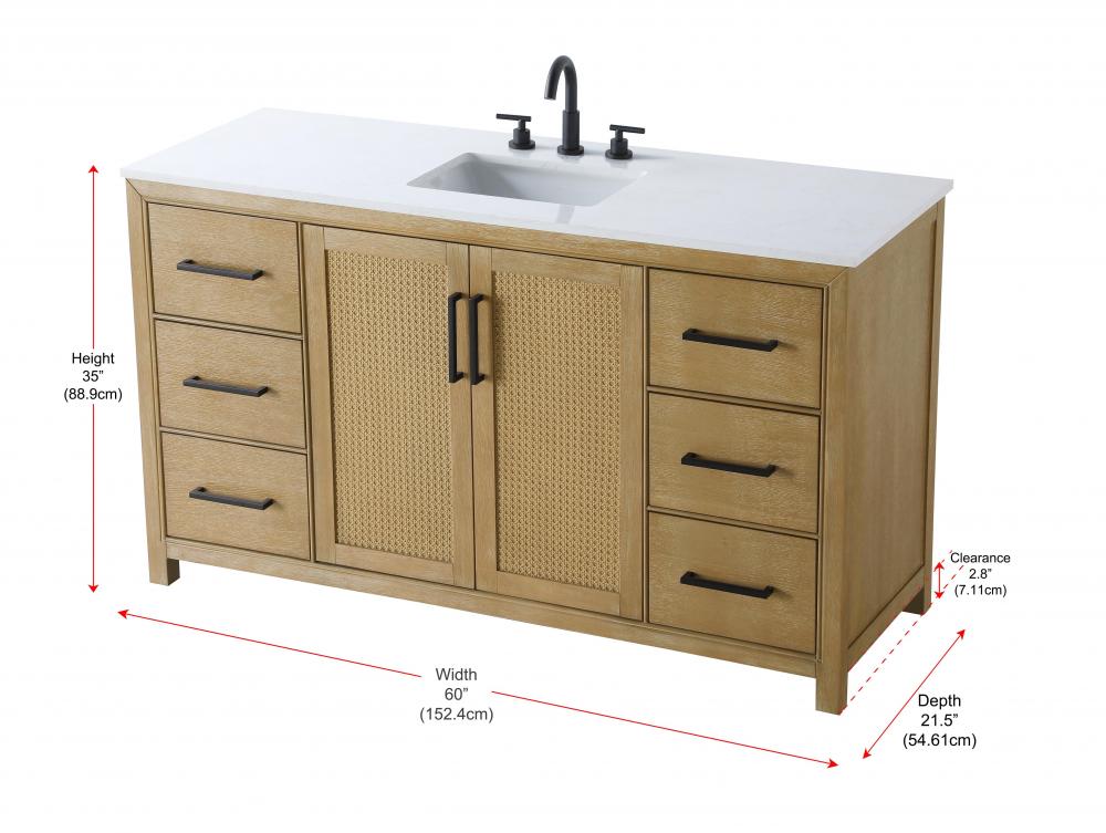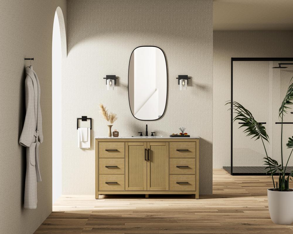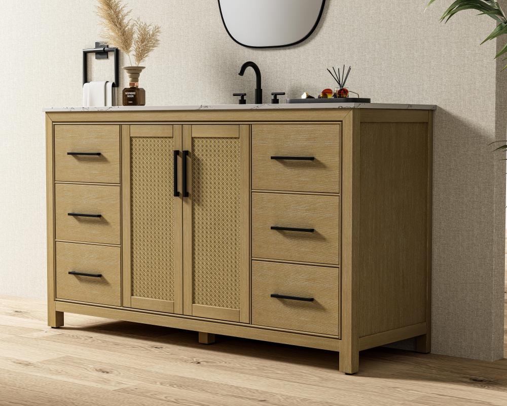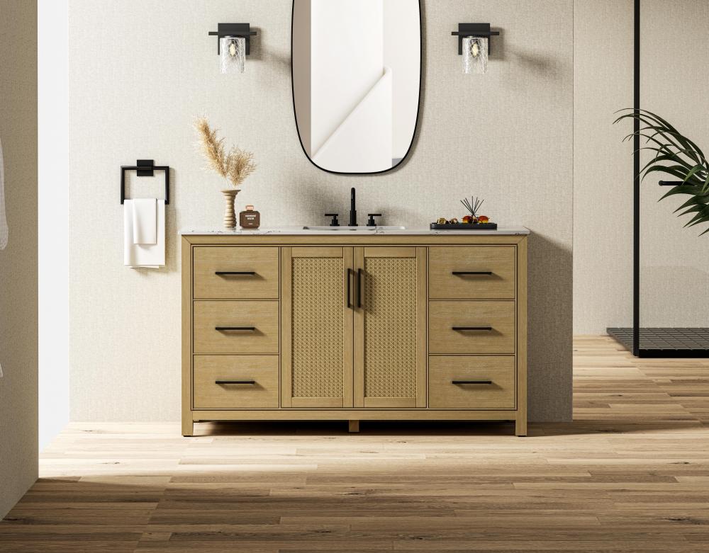 Perfect for those with an eye for detail and quality, this transitional vanity blends modern design with timeless elegance. Available in five stunning finishes, from Crisp White to Linen Oak, the wood grain visuals of the oak options bring warmth and character to any bathroom. The caning design on the Shaker-style door panels adds texture and a touch of refinement, while the soft-closing doors and drawers ensure smooth, quiet functionality. Topped with a white engineered marble countertop, the vanity offers both luxury and practicality, complete with pre-drilled faucet holes for customization. A concealed overflow and U-shaped shelf for plumbing make installation effortless, and the slender black metal pulls provide a sleek contrast.