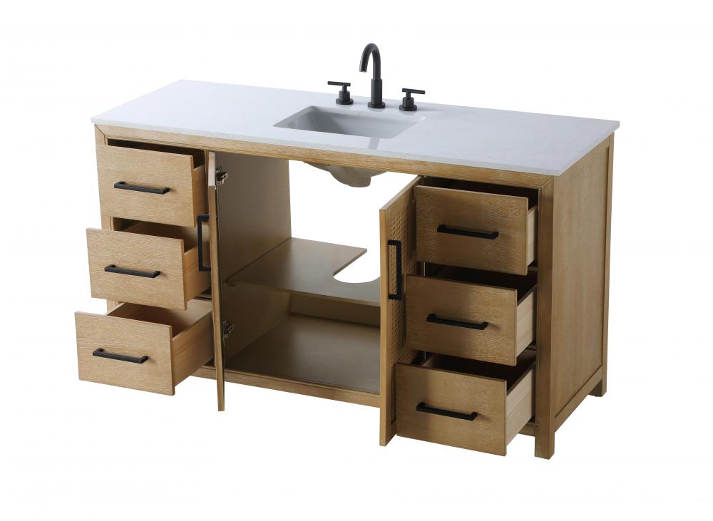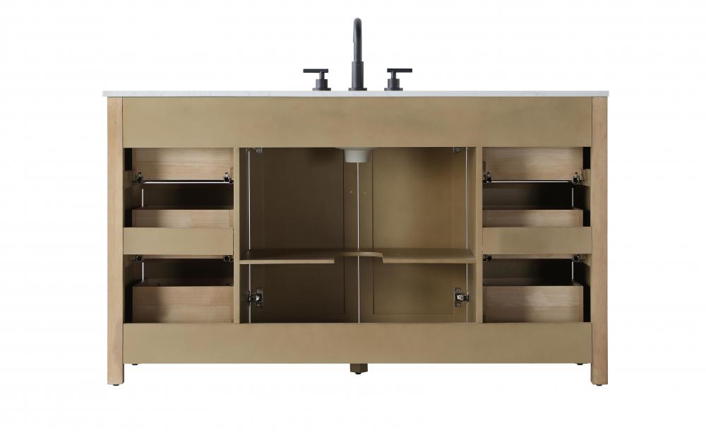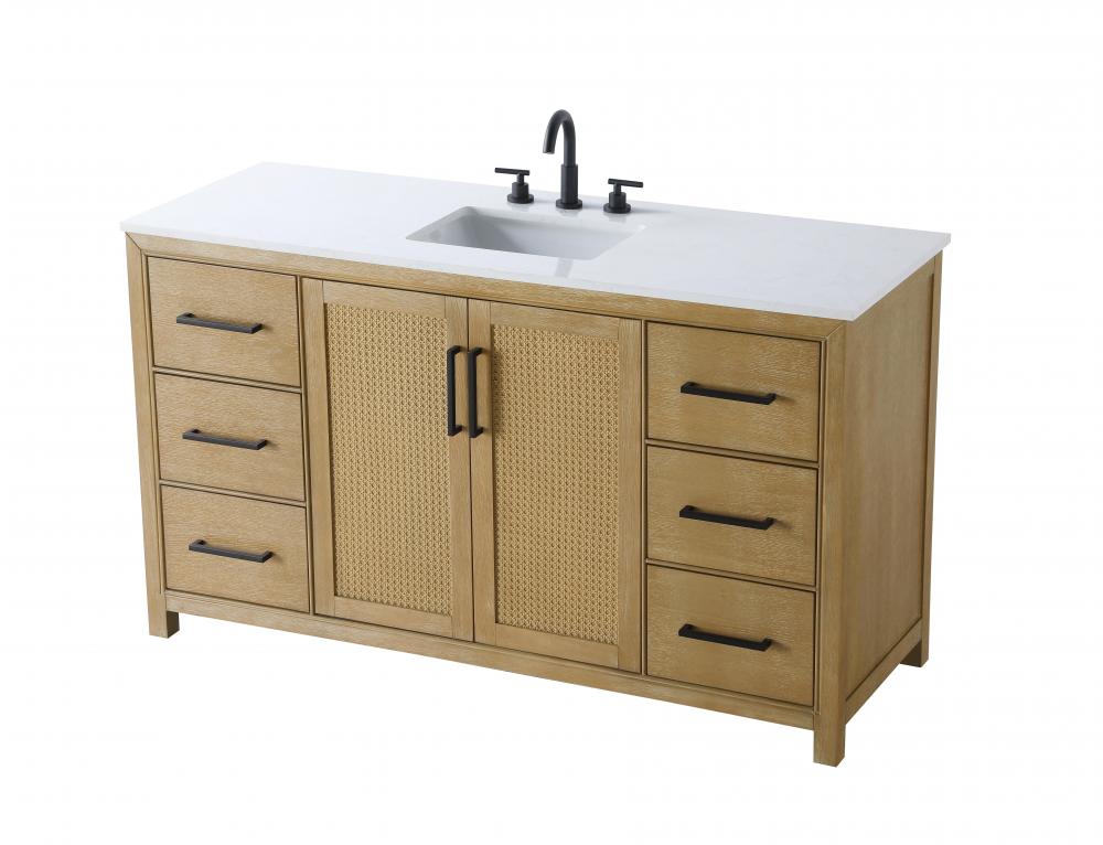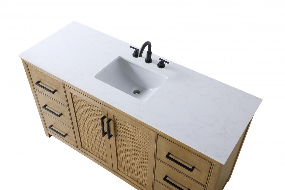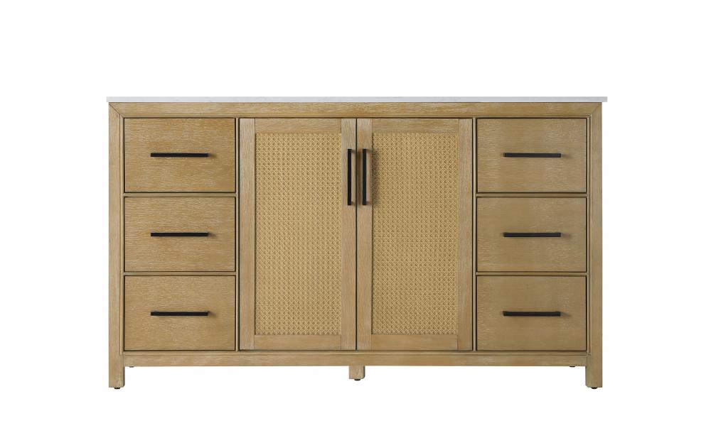 Perfect for those with an eye for detail and quality, this transitional vanity blends modern design with timeless elegance. Available in five stunning finishes, from Crisp White to Linen Oak, the wood grain visuals of the oak options bring warmth and character to any bathroom. The caning design on the Shaker-style door panels adds texture and a touch of refinement, while the soft-closing doors and drawers ensure smooth, quiet functionality. Topped with a white engineered marble countertop, the vanity offers both luxury and practicality, complete with pre-drilled faucet holes for customization. A concealed overflow and U-shaped shelf for plumbing make installation effortless, and the slender black metal pulls provide a sleek contrast.