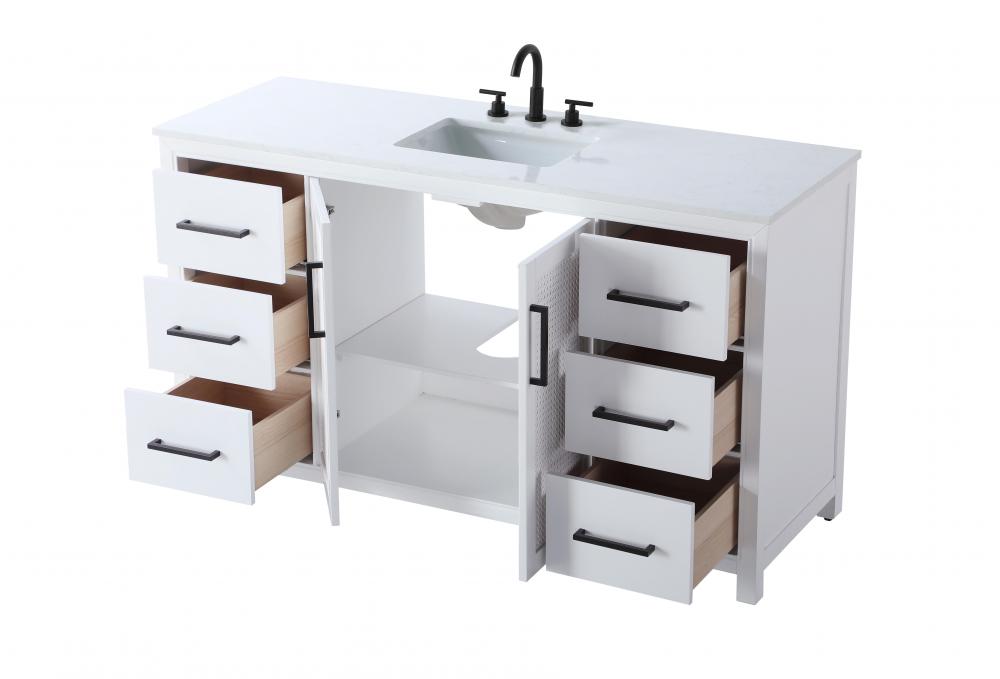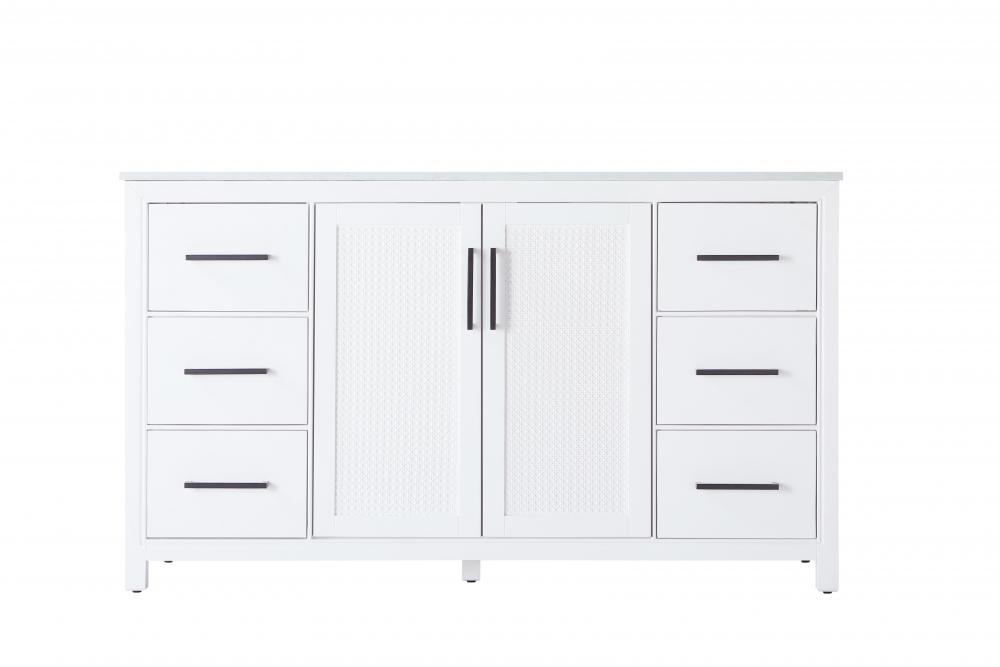 The slender black metal handle pulls on the doors and drawers offer a sleek, modern contrast to the white finish, adding to the vanity's sophisticated look.