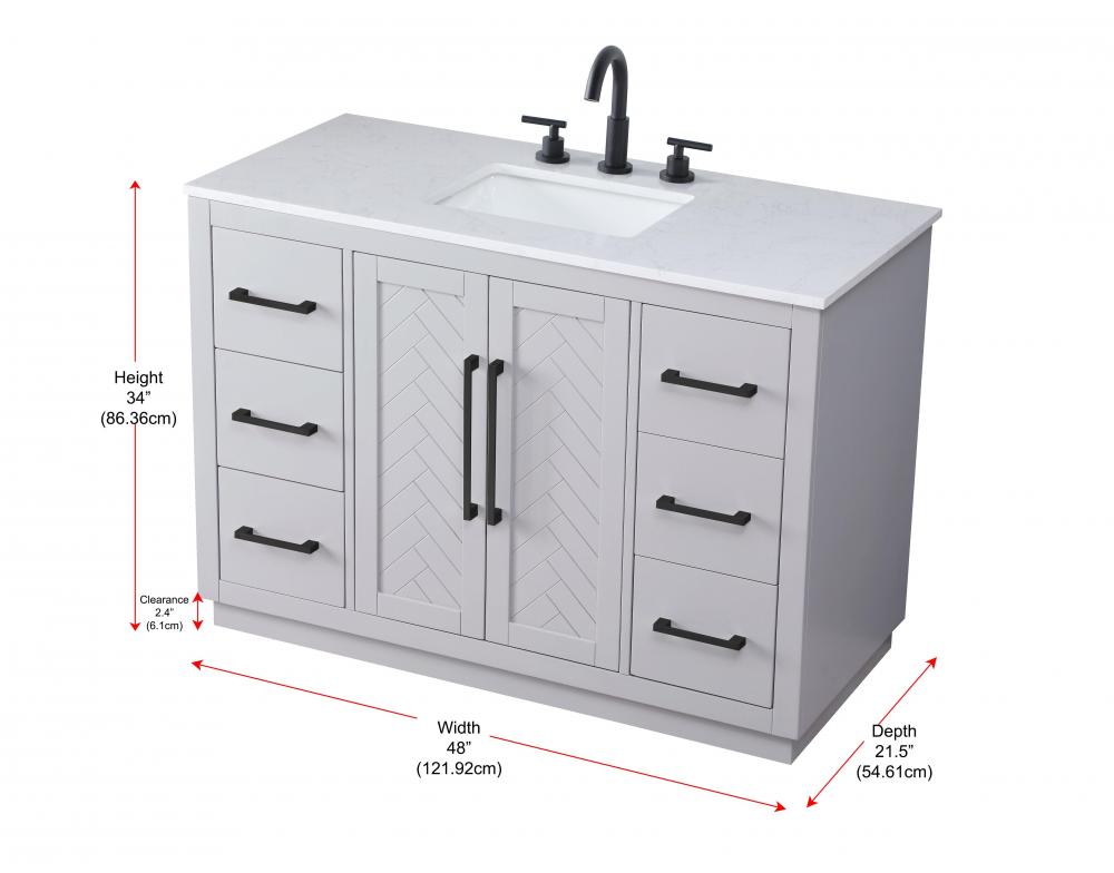 This transitional bathroom vanity offers the perfect blend of timeless style and modern functionality. Available in five refined finishes—crisp white, sleek grey, chocolate oak, honey oak, and linen oak—it complements a range of decor styles, from classic to contemporary. The stunning herringbone design on the Shaker-style door panels adds texture and craftsmanship to the piece. Topped with a white engineered marble countertop featuring subtle veining, it provides both beauty and durability. The long black metal pulls on the soft-closing doors and the thin bar pulls on the drawers add sleek, modern detailing. Practical features include a concealed overflow, a back panel cutout for easy plumbing installation, and a U-shaped cutout shelf to fit plumbing while maximizing storage space. with a toe kick all around the base, this vanity is thoughtfully designed to blend form and function in any bathroom setting.