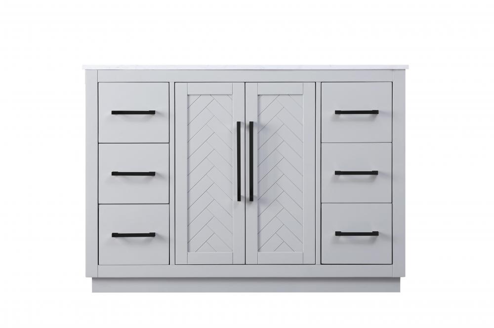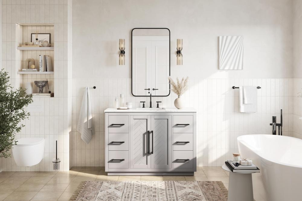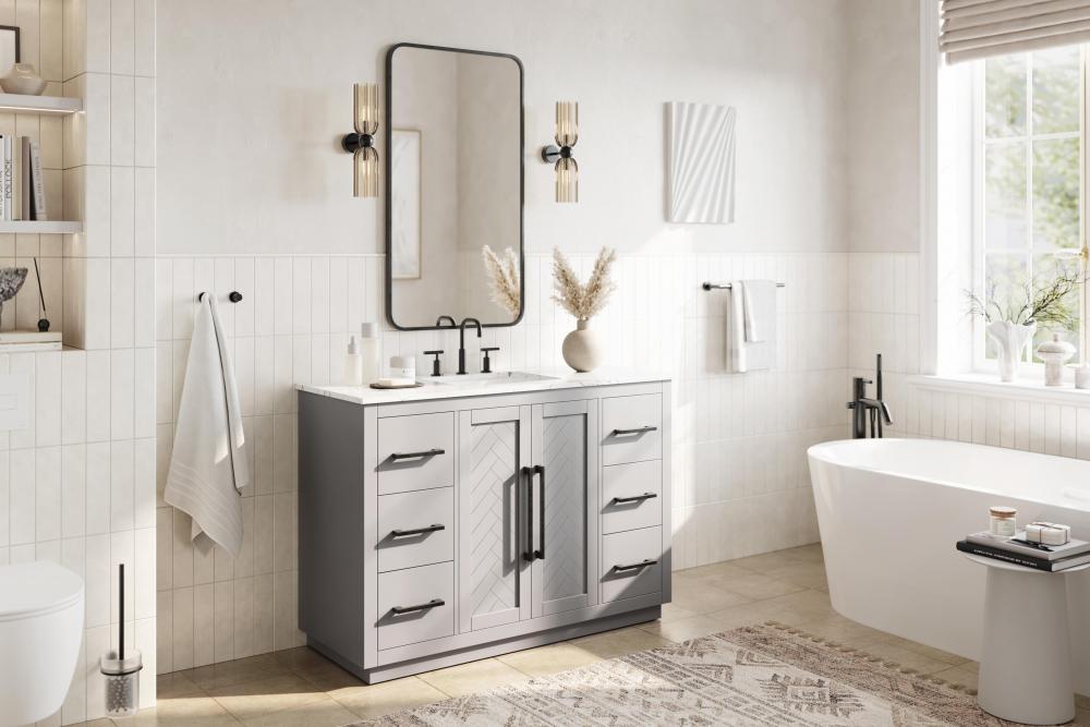 Each finish enhances the unique herringbone design on the Shaker-style door panels, adding a touch of craftsmanship and texture that elevates the overall design of the vanity.