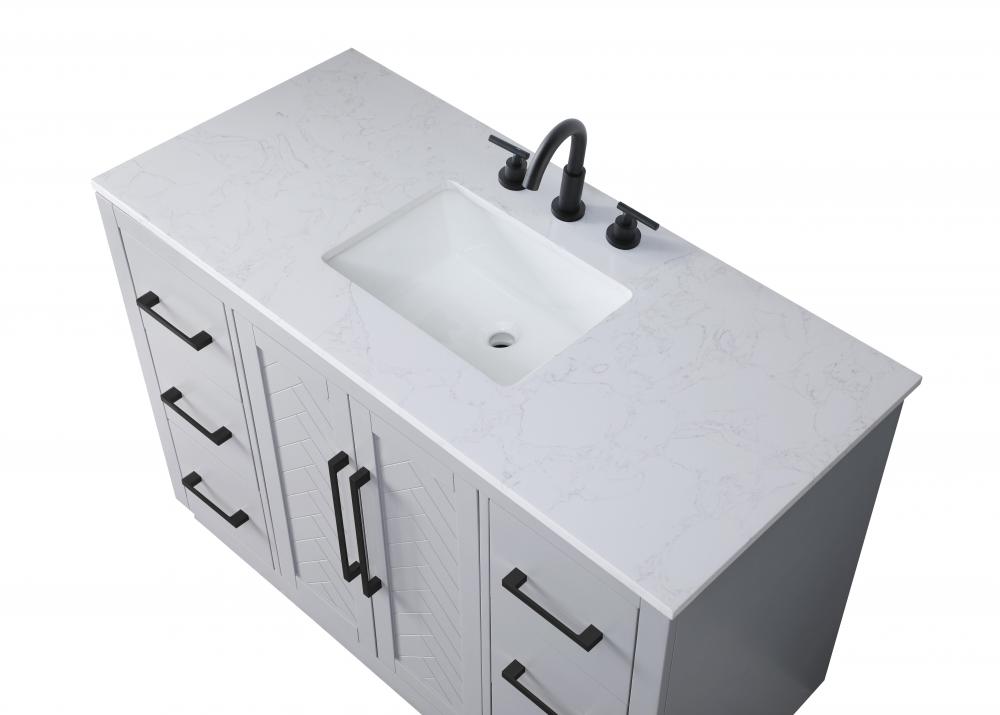 The vanity is topped with a white engineered marble countertop featuring subtle, natural-looking veining that creates a luxurious yet low-maintenance surface. This countertop adds elegance while providing durability, making it ideal for everyday use.