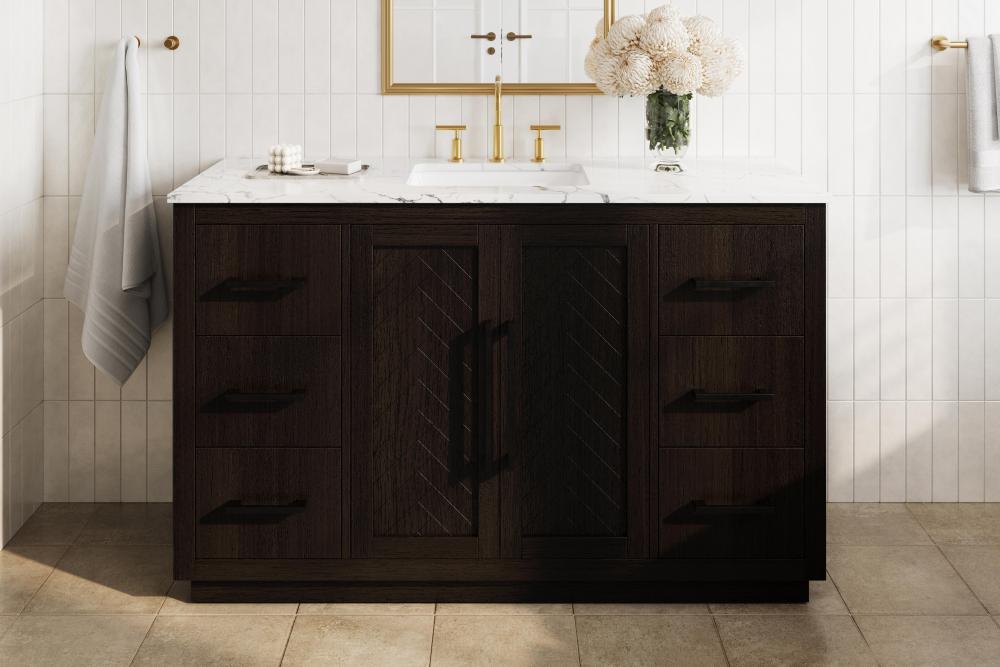 Each finish enhances the unique herringbone design on the Shaker-style door panels, adding a touch of craftsmanship and texture that elevates the overall design of the vanity.