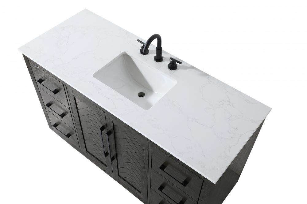 This transitional bathroom vanity offers the perfect blend of timeless style and modern functionality. Available in five refined finishes—crisp white, sleek grey, chocolate oak, honey oak, and linen oak—it complements a range of decor styles, from classic to contemporary. The stunning herringbone design on the Shaker-style door panels adds texture and craftsmanship to the piece. Topped with a white engineered marble countertop featuring subtle veining, it provides both beauty and durability. The long black metal pulls on the soft-closing doors and the thin bar pulls on the drawers add sleek, modern detailing. Practical features include a concealed overflow, a back panel cutout for easy plumbing installation, and a U-shaped cutout shelf to fit plumbing while maximizing storage space. with a toe kick all around the base, this vanity is thoughtfully designed to blend form and function in any bathroom setting.