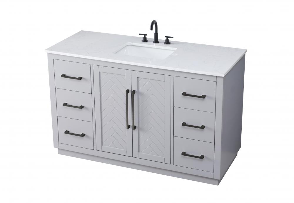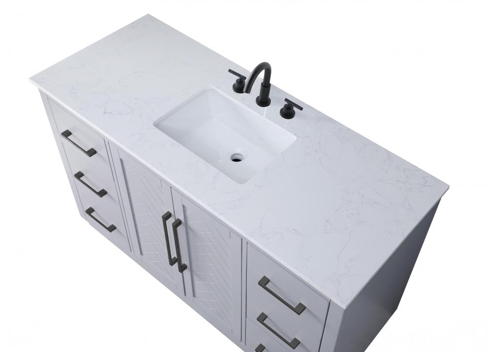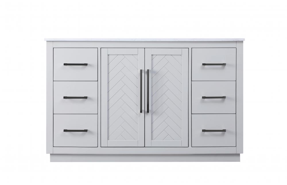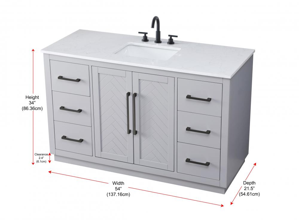 This transitional bathroom vanity offers the perfect blend of timeless style and modern functionality. Available in five refined finishes—crisp white, sleek grey, chocolate oak, honey oak, and linen oak—it complements a range of decor styles, from classic to contemporary. The stunning herringbone design on the Shaker-style door panels adds texture and craftsmanship to the piece. Topped with a white engineered marble countertop featuring subtle veining, it provides both beauty and durability. The long black metal pulls on the soft-closing doors and the thin bar pulls on the drawers add sleek, modern detailing. Practical features include a concealed overflow, a back panel cutout for easy plumbing installation, and a U-shaped cutout shelf to fit plumbing while maximizing storage space. with a toe kick all around the base, this vanity is thoughtfully designed to blend form and function in any bathroom setting.