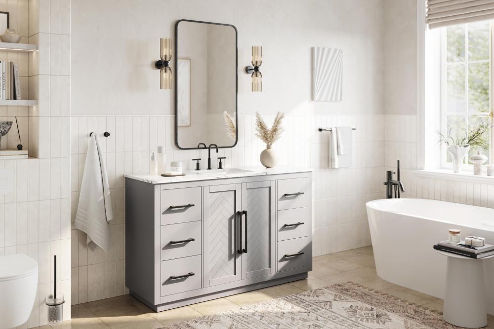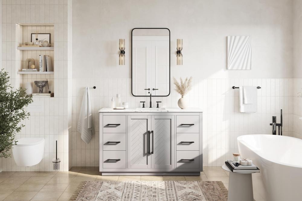 Each finish enhances the unique herringbone design on the Shaker-style door panels, adding a touch of craftsmanship and texture that elevates the overall design of the vanity.