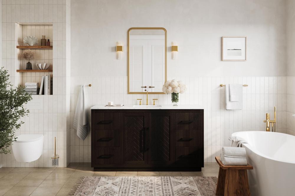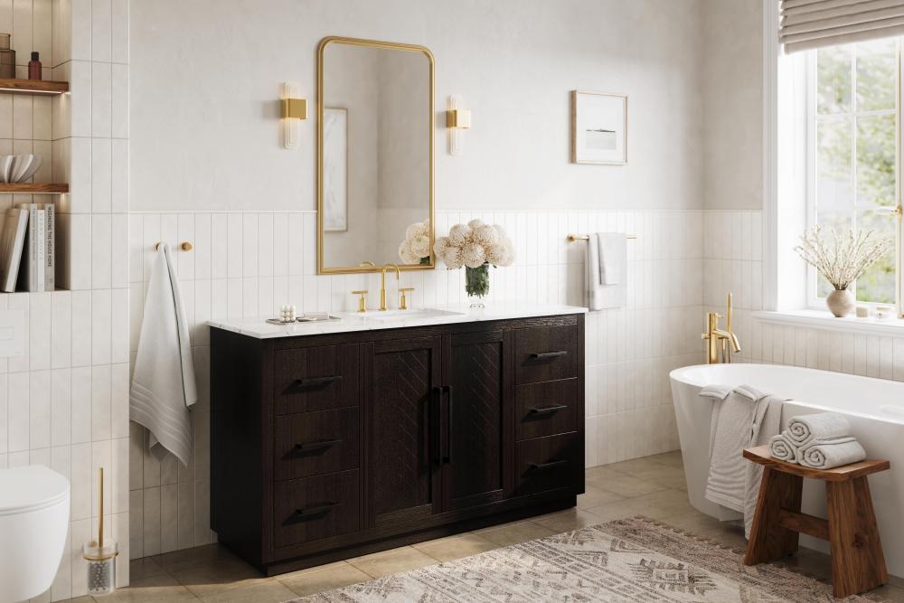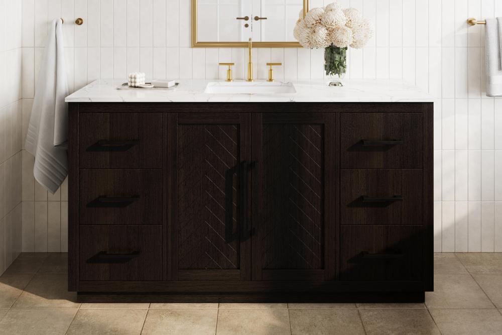 Each finish enhances the unique herringbone design on the Shaker-style door panels, adding a touch of craftsmanship and texture that elevates the overall design of the vanity.