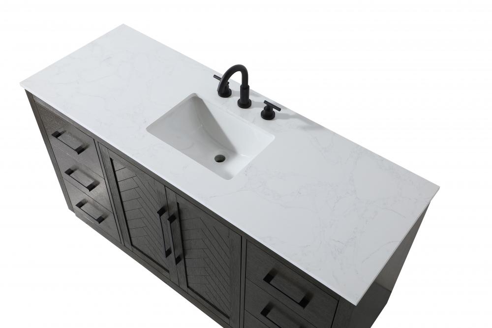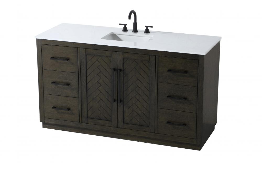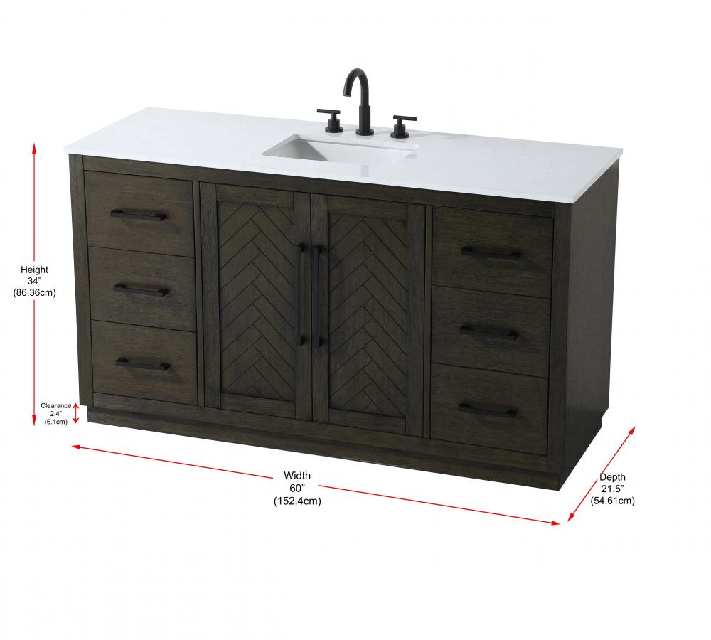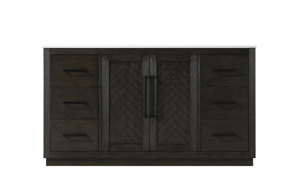 This transitional bathroom vanity offers the perfect blend of timeless style and modern functionality. Available in five refined finishes—crisp white, sleek grey, chocolate oak, honey oak, and linen oak—it complements a range of decor styles, from classic to contemporary. The stunning herringbone design on the Shaker-style door panels adds texture and craftsmanship to the piece. Topped with a white engineered marble countertop featuring subtle veining, it provides both beauty and durability. The long black metal pulls on the soft-closing doors and the thin bar pulls on the drawers add sleek, modern detailing. Practical features include a concealed overflow, a back panel cutout for easy plumbing installation, and a U-shaped cutout shelf to fit plumbing while maximizing storage space. with a toe kick all around the base, this vanity is thoughtfully designed to blend form and function in any bathroom setting.