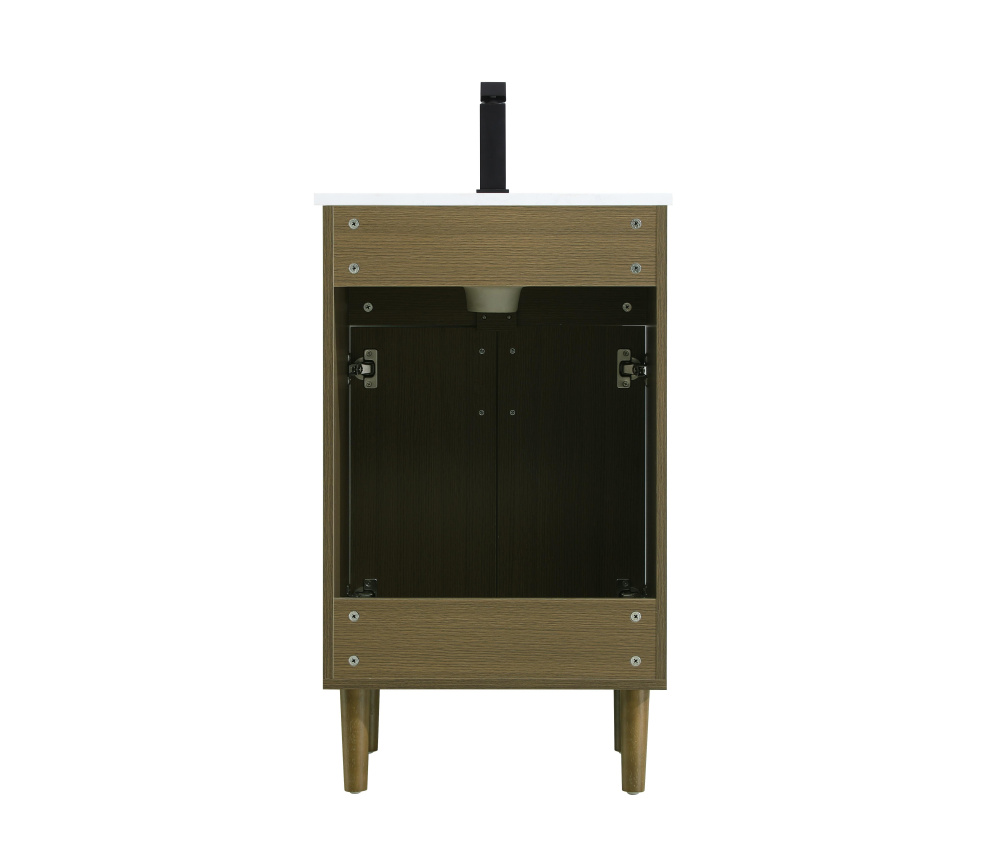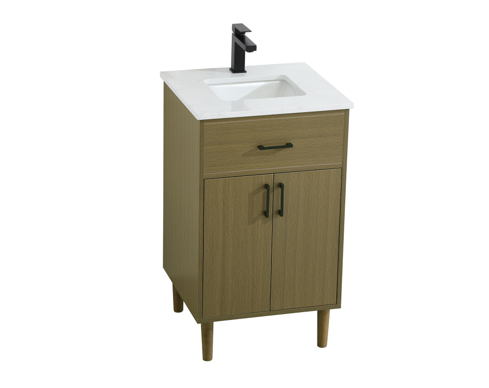 Transform your bathroom with this mid-century modern vanity, designed to bring both functionality and a sense of style to your space. Its clean lines, minimalist design, and tapered solid wood legs evoke a timeless charm, perfect for blending with modern and transitional interiors. The engineered marble countertop, with its unique faux marble veining, adds a refined, luxurious touch, while the porcelain sink is both durable and easy to maintain. Practicality meets aesthetics with a faux drawer for balanced design and a spacious double-door cabinet for efficient storage. Constructed from solid wood and MDF, this vanity offers lasting durability, while adjustable foot levelers ensure stability on any floor. Shipped mostly assembled, the solid wood legs can be effortlessly twisted into place, making installation quick and hassle-free.