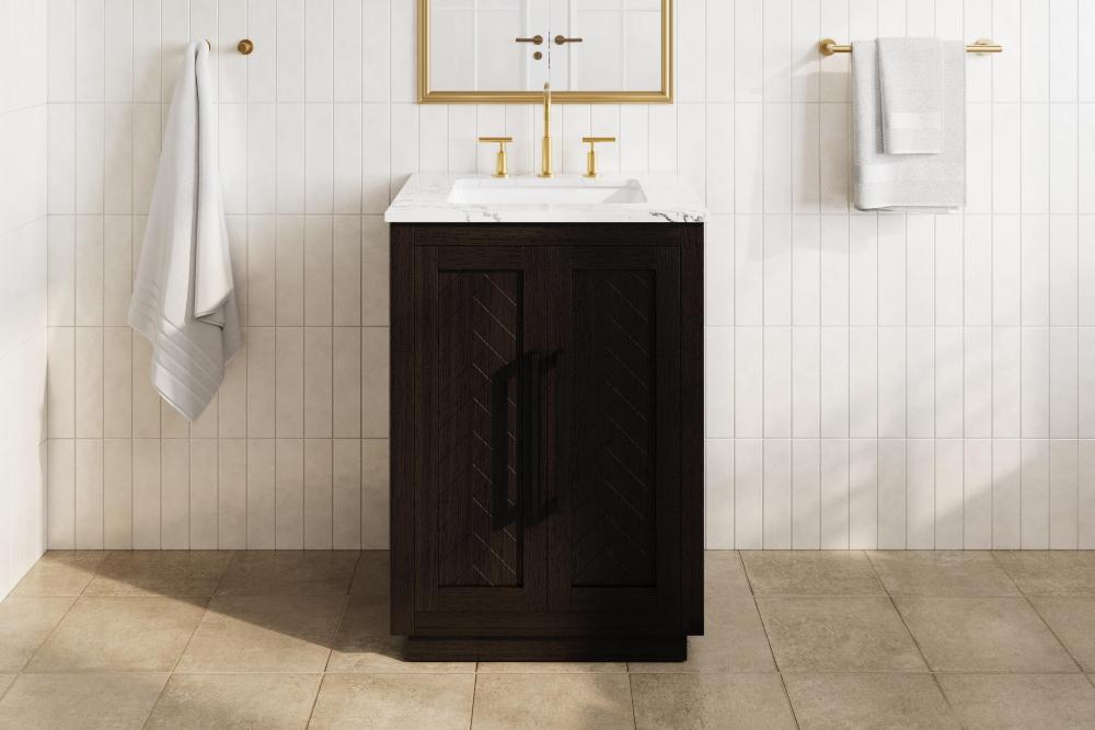 Each finish enhances the unique herringbone design on the Shaker-style door panels, adding a touch of craftsmanship and texture that elevates the overall design of the vanity.