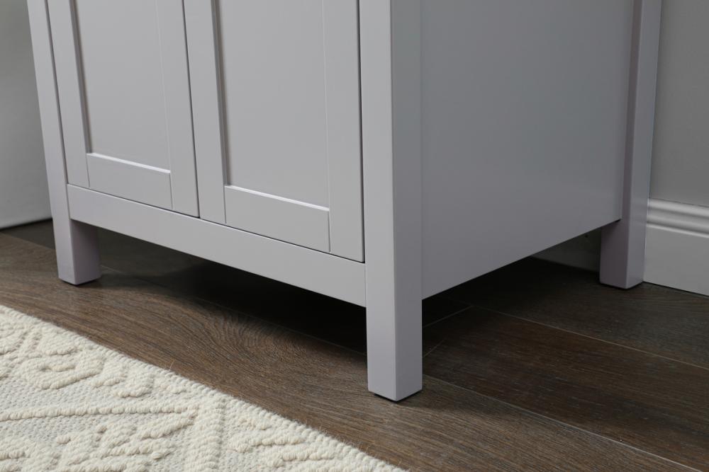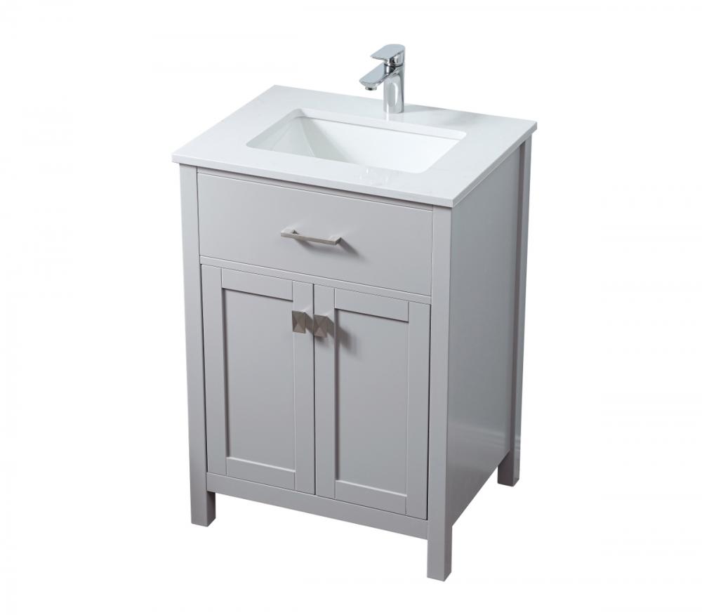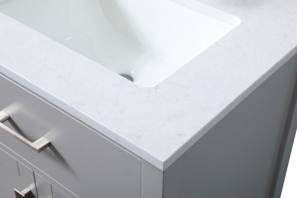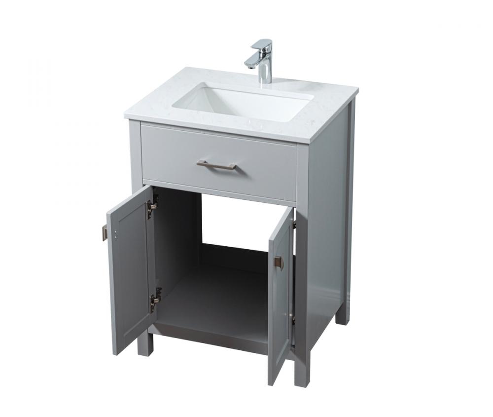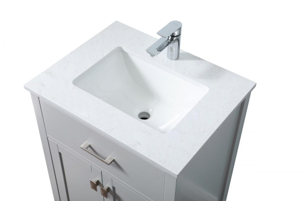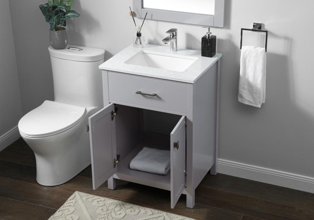 Elevate your bathroom aesthetic with our precision-crafted 24-inch vanity, featuring a chic straight edge cut and an engineered marble top that infuses a dash of modern elegance into your space. Designed for seamless access and ample storage, the vanity showcases a single functional cabinet with two soft close doors, paired with a faux top drawer. The sophisticated undermount porcelain sink seamlessly merges style with practicality, while the inclusion of stylish hardware adds a personalized touch and ensures convenient access to storage. Boasting a lower open shelf for additional storage, this vanity seamlessly blends functionality with style, providing a practical area for decor or essentials. Complete with a single pre-drilled hole for seamless faucet installation, our versatile vanity allows you to effortlessly personalize your bathroom, adding a final touch of elegance to your unique space. Redefine your bathroom experience with this stylish and functional addition.