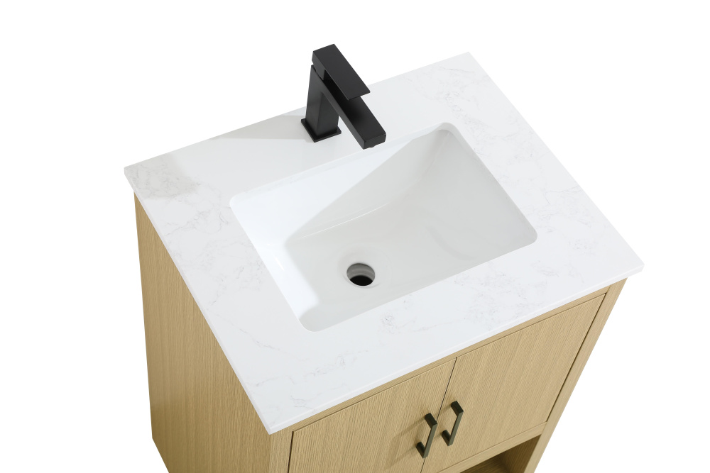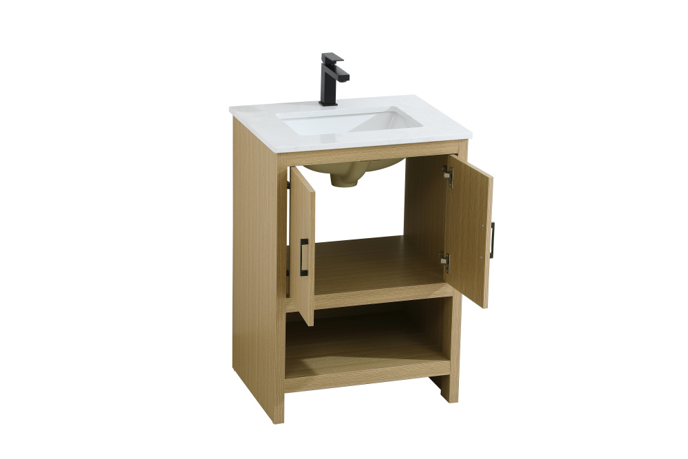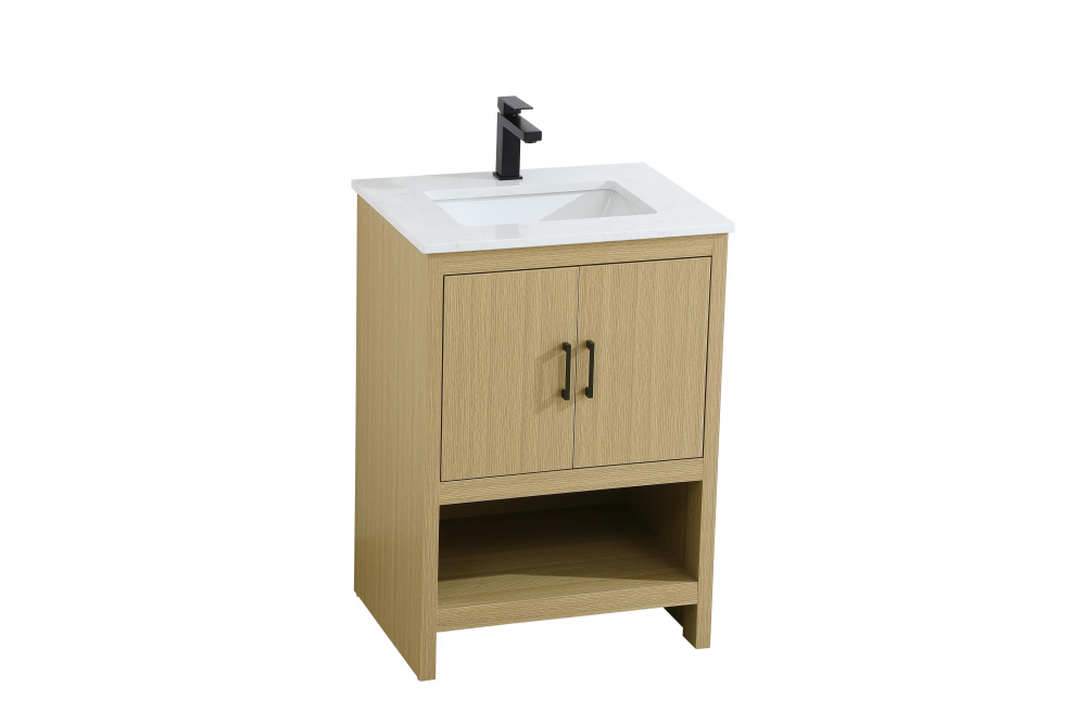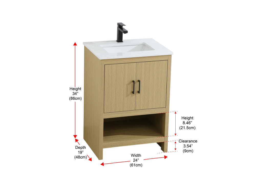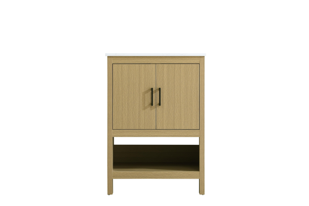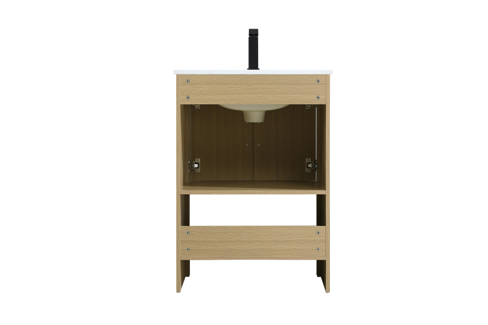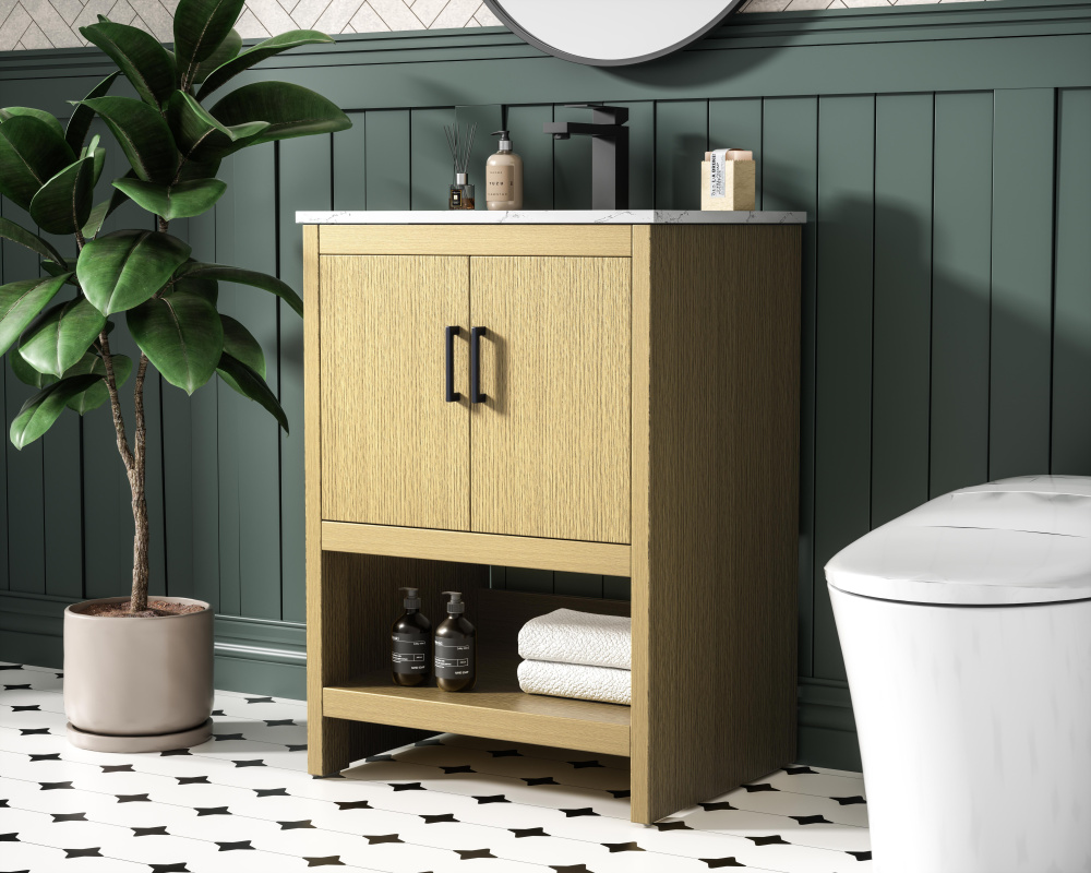 Bring modern style and practicality to your bathroom with this sleek vanity, designed to complement contemporary spaces. The flat-panel doors create a clean, minimalist look, while the open bottom shelf provides functional storage or a space to display decorative items. The engineered marble countertop showcases unique faux marbling, adding a refined and distinct touch to the design. The durable porcelain sink is easy to maintain, and the single pre-drilled faucet hole simplifies the installation process. Constructed from high-quality MDF with a versatile woodgrain finish, this vanity combines durability with timeless style. With adjustable foot levelers for stability on uneven floors and a fully assembled design, this piece offers a seamless addition to your bathroom.
