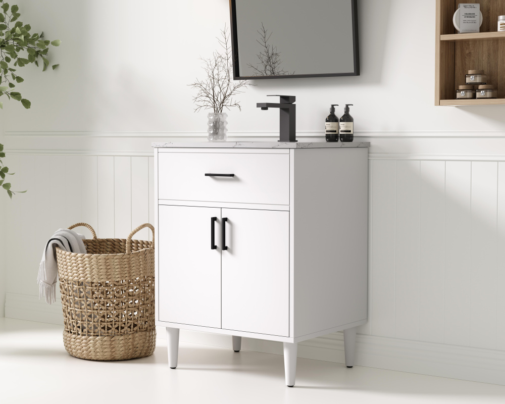 Transform your bathroom with this mid-century modern vanity, designed to bring both functionality and a sense of style to your space. Its clean lines, minimalist design, and tapered solid wood legs evoke a timeless charm, perfect for blending with modern and transitional interiors. The engineered marble countertop, with its unique faux marble veining, adds a refined, luxurious touch, while the porcelain sink is both durable and easy to maintain. Practicality meets aesthetics with a faux drawer for balanced design and a spacious double-door cabinet for efficient storage. Constructed from solid wood and MDF, this vanity offers lasting durability, while adjustable foot levelers ensure stability on any floor. Shipped mostly assembled, the solid wood legs can be effortlessly twisted into place, making installation quick and hassle-free.
