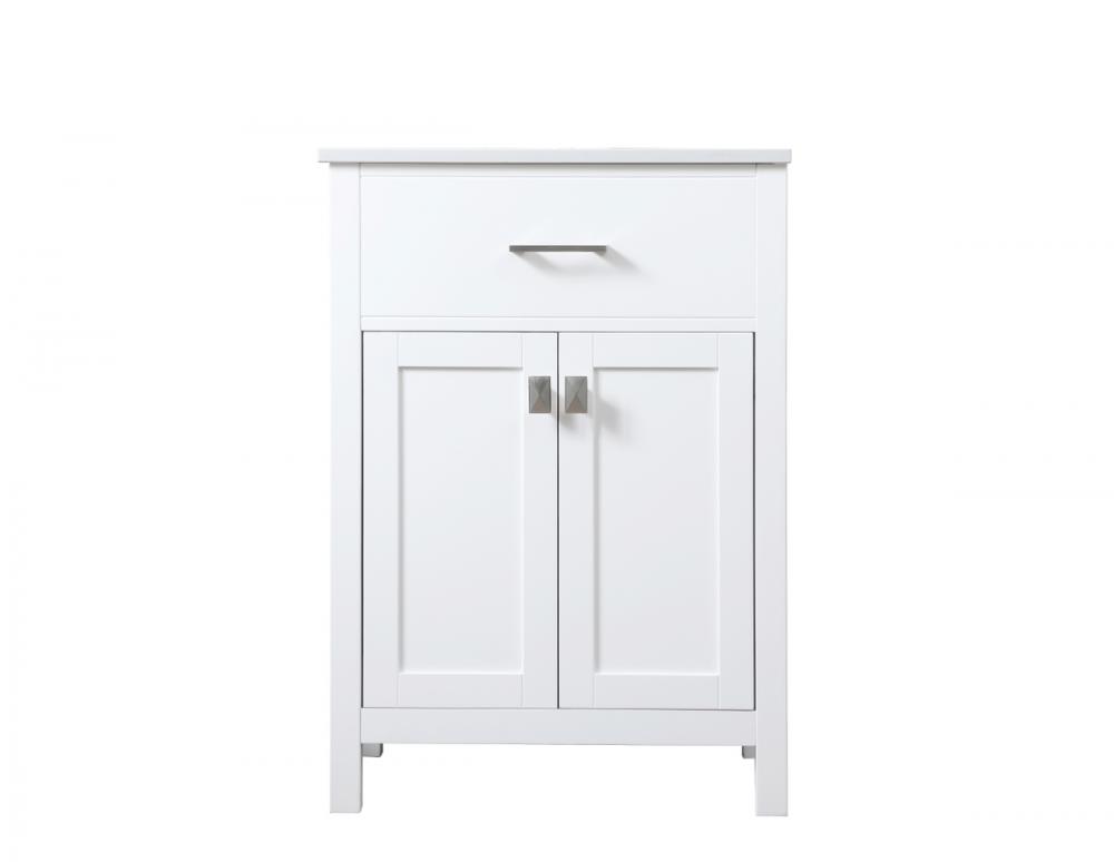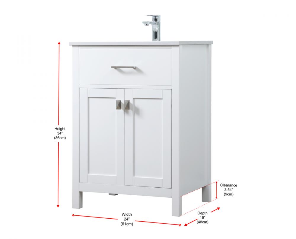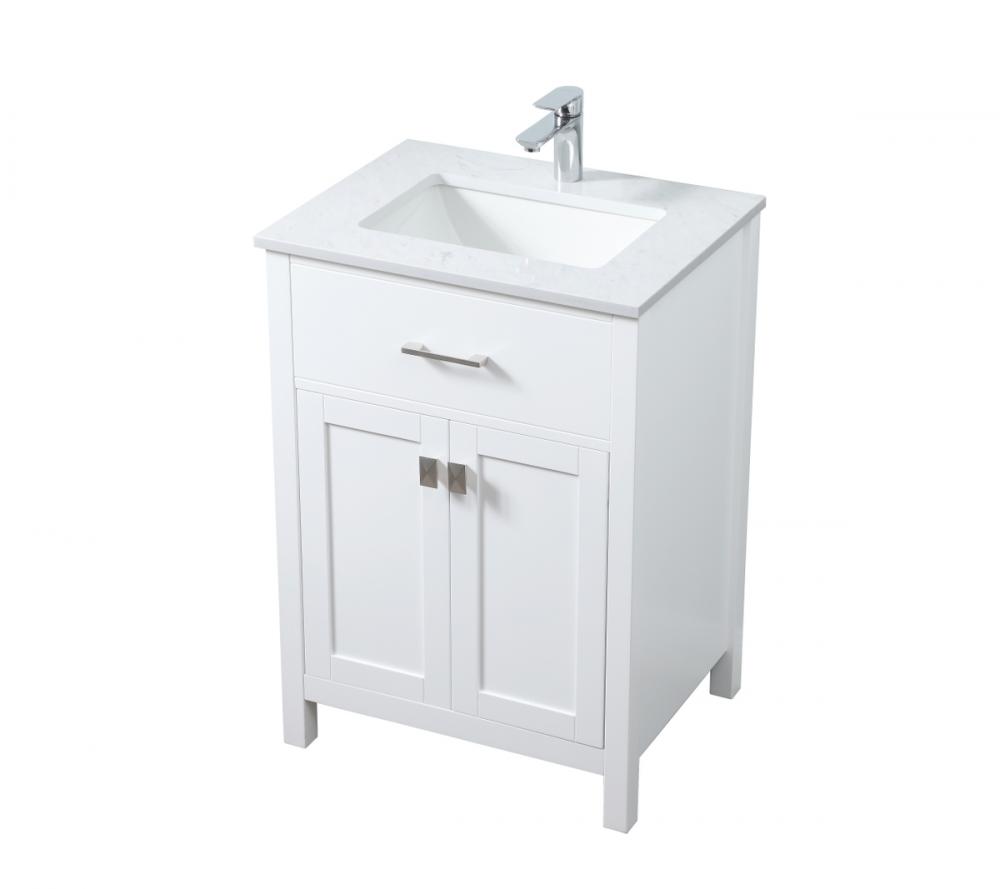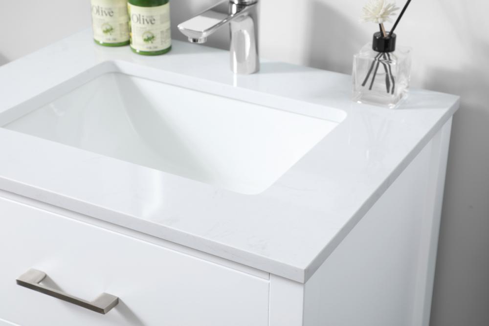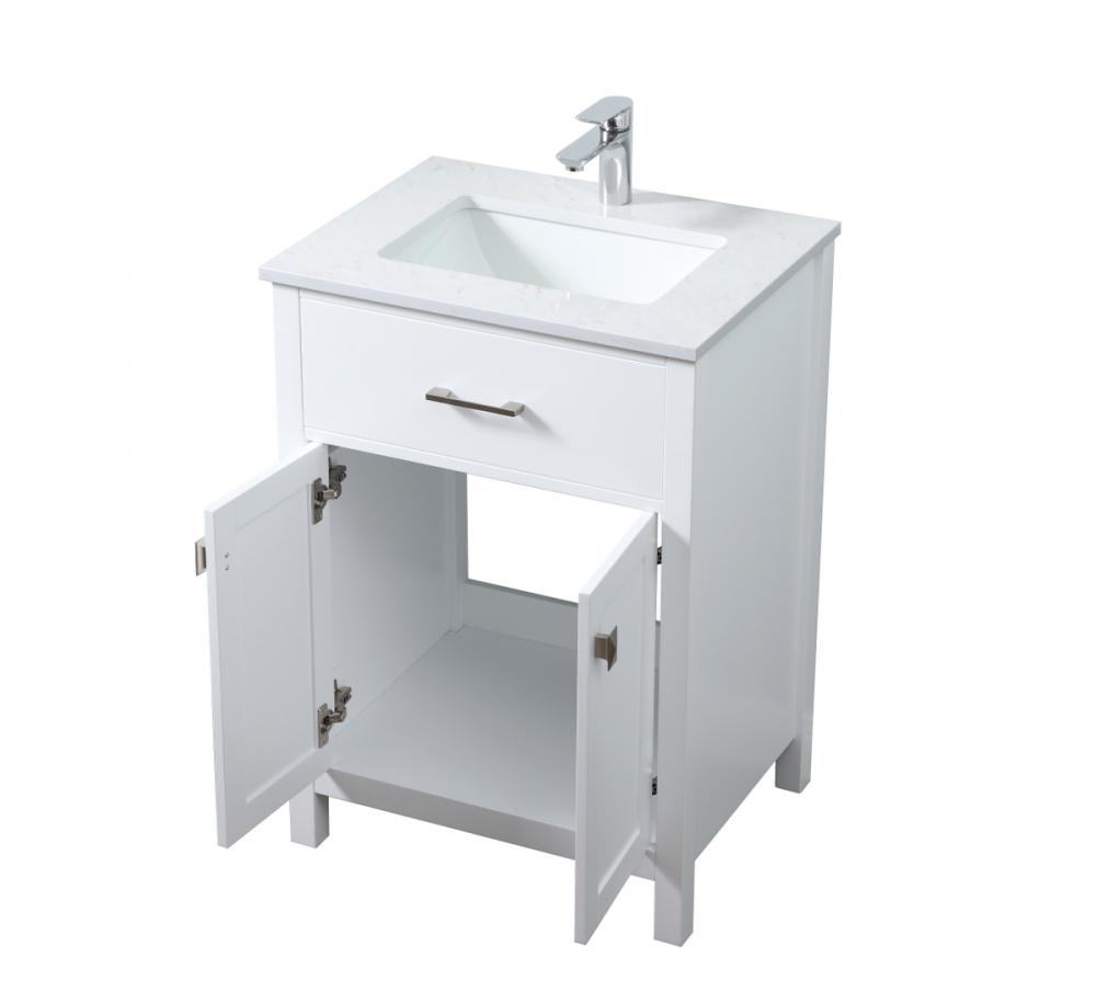 Elevate your bathroom aesthetic with our precision-crafted 24-inch vanity, featuring a chic straight edge cut and an engineered marble top that infuses a dash of modern elegance into your space. Designed for seamless access and ample storage, the vanity showcases a single functional cabinet paired with a faux top drawer, both adorned with soft-close doors. The sophisticated undermount porcelain sink seamlessly merges style with practicality, while the inclusion of stylish hardware adds a personalized touch and ensures convenient access to storage. Boasting a lower open shelf for additional storage, this vanity seamlessly blends functionality with style, providing a practical area for decor or essentials. Complete with a single pre-drilled hole for seamless faucet installation, our versatile vanity allows you to effortlessly personalize your bathroom, adding a final touch of elegance to your unique space. Redefine your bathroom experience with this stylish and functional addition.