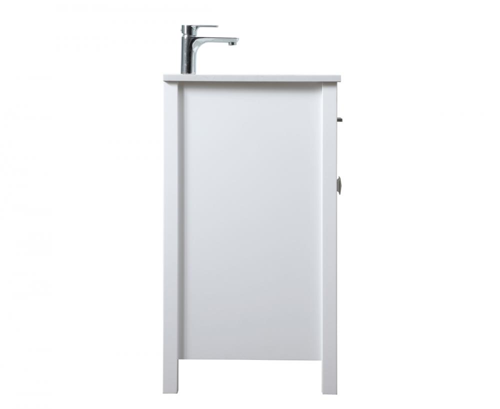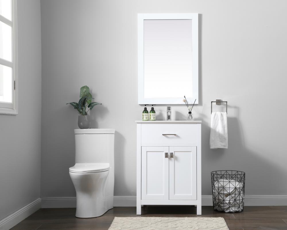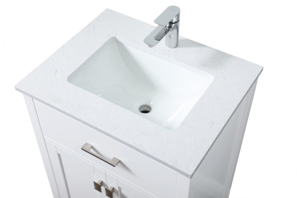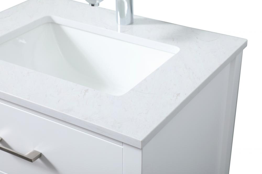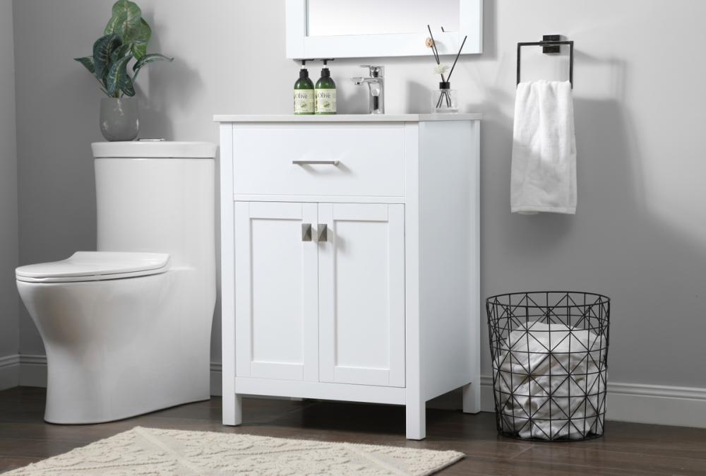 Elevate your bathroom aesthetic with our precision-crafted 24-inch vanity, featuring a chic straight edge cut and an engineered marble top that infuses a dash of modern elegance into your space. Designed for seamless access and ample storage, the vanity showcases a single functional cabinet paired with a faux top drawer, both adorned with soft-close doors. The sophisticated undermount porcelain sink seamlessly merges style with practicality, while the inclusion of stylish hardware adds a personalized touch and ensures convenient access to storage. Boasting a lower open shelf for additional storage, this vanity seamlessly blends functionality with style, providing a practical area for decor or essentials. Complete with a single pre-drilled hole for seamless faucet installation, our versatile vanity allows you to effortlessly personalize your bathroom, adding a final touch of elegance to your unique space. Redefine your bathroom experience with this stylish and functional addition.