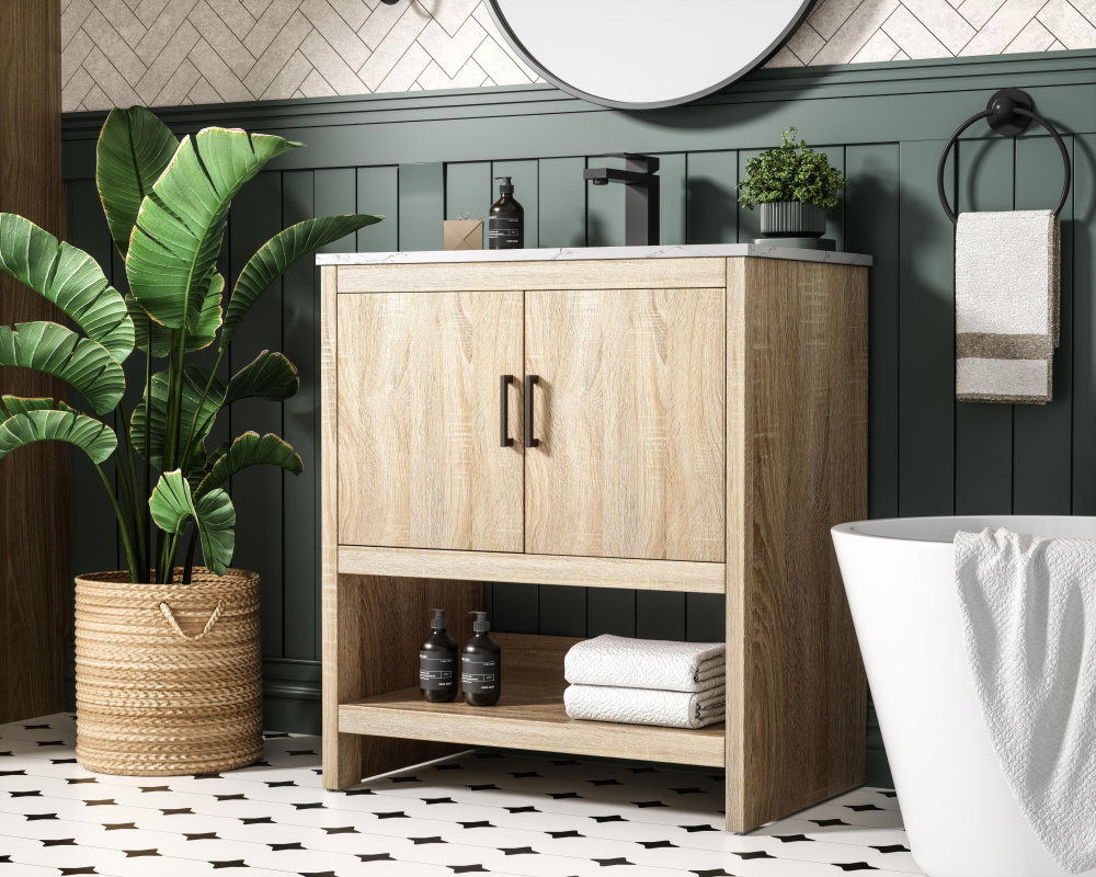 Bring modern style and practicality to your bathroom with this sleek vanity, designed to complement contemporary spaces. The flat-panel doors create a clean, minimalist look, while the open bottom shelf provides functional storage or a space to display decorative items. The engineered marble countertop showcases unique faux marbling, adding a refined and distinct touch to the design. The durable porcelain sink is easy to maintain, and the single pre-drilled faucet hole simplifies the installation process. Constructed from high-quality MDF with a versatile woodgrain finish, this vanity combines durability with timeless style. With adjustable foot levelers for stability on uneven floors and a fully assembled design, this piece offers a seamless addition to your bathroom.