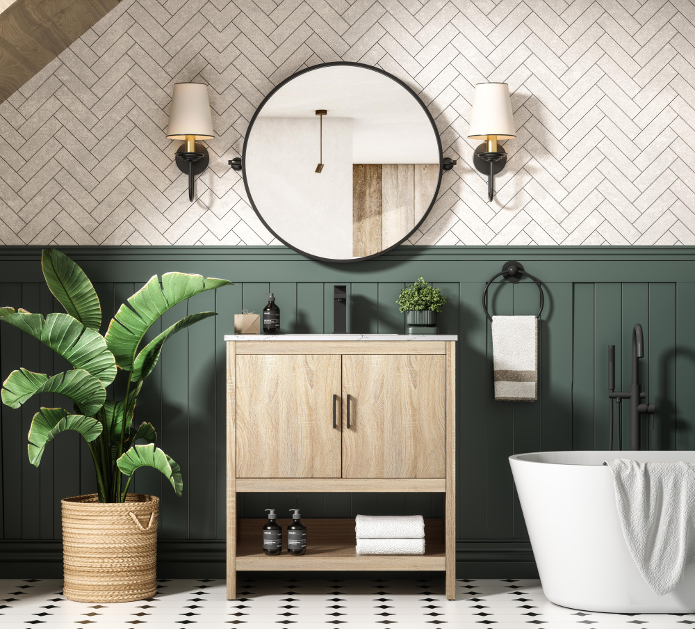 A natural wood-inspired finish adds warmth and texture to your bathroom.