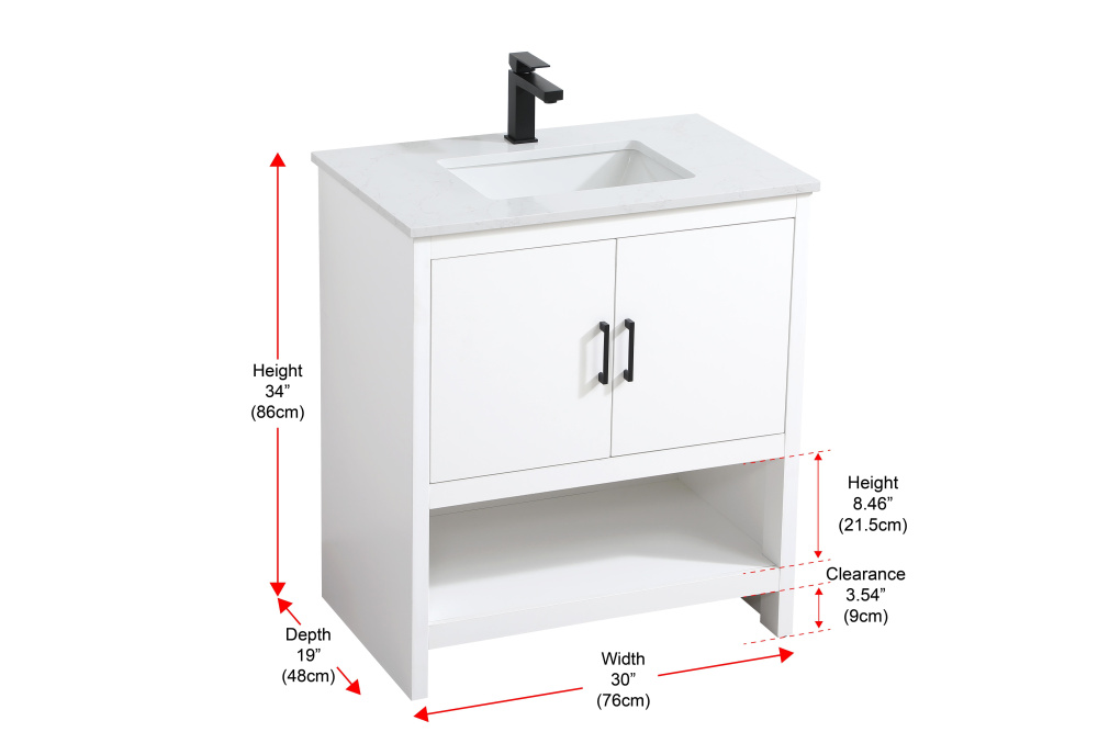 Bring modern style and practicality to your bathroom with this sleek vanity, designed to complement contemporary spaces. The flat-panel doors create a clean, minimalist look, while the open bottom shelf provides functional storage or a space to display decorative items. The engineered marble countertop showcases unique faux marbling, adding a refined and distinct touch to the design. The durable porcelain sink is easy to maintain, and the single pre-drilled faucet hole simplifies the installation process. Constructed from high-quality MDF with a versatile white finish, this vanity combines durability with timeless style. With adjustable foot levelers for stability on uneven floors and a fully assembled design, this piece offers a seamless addition to your bathroom.