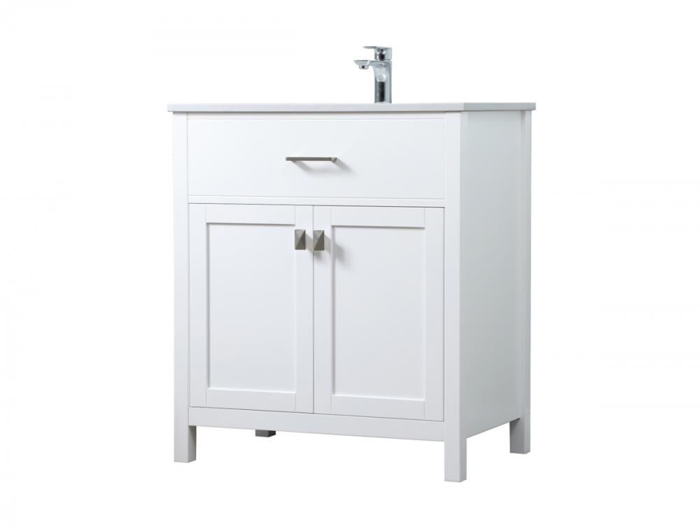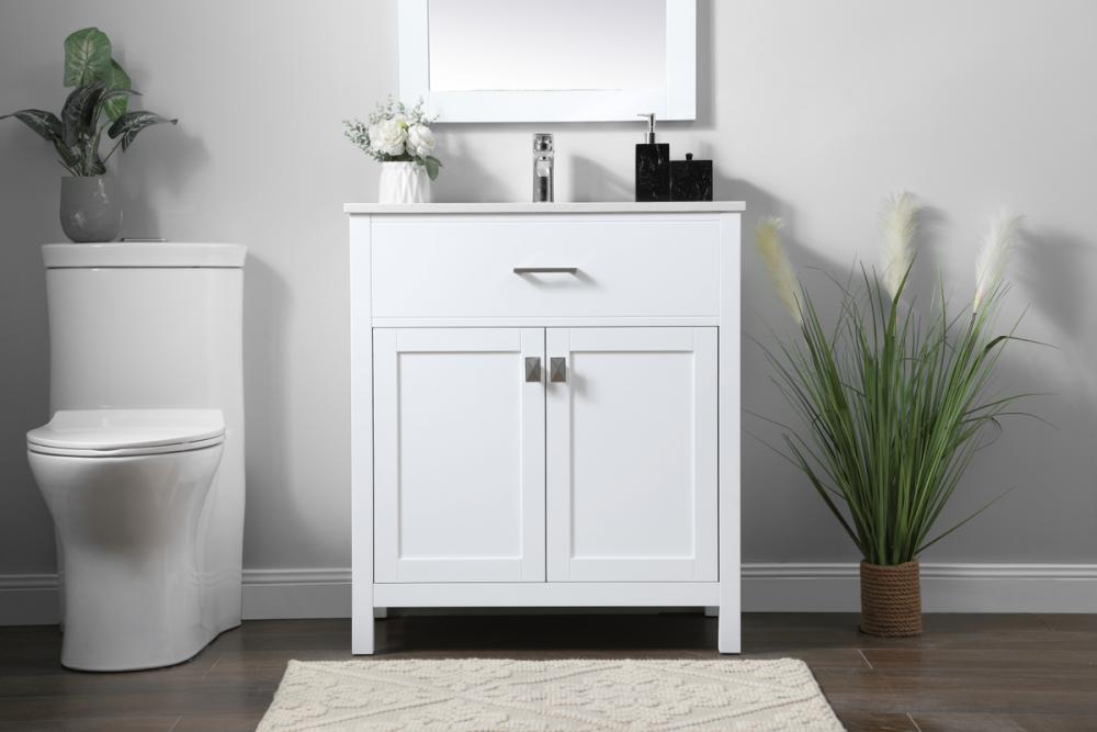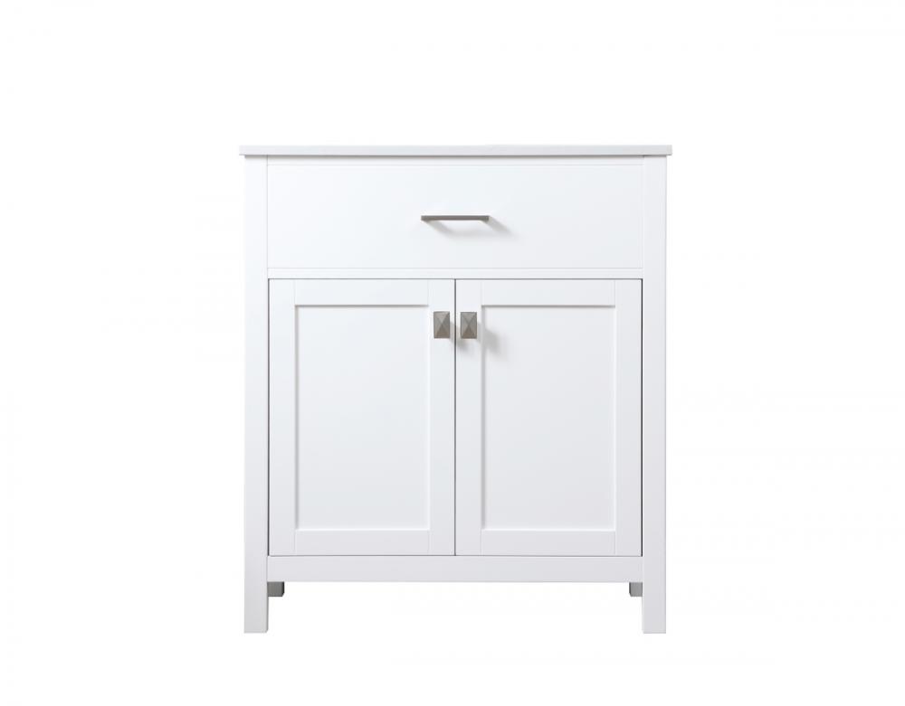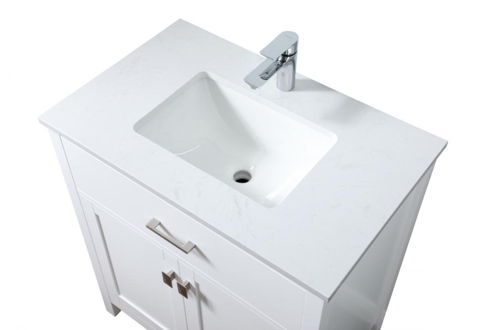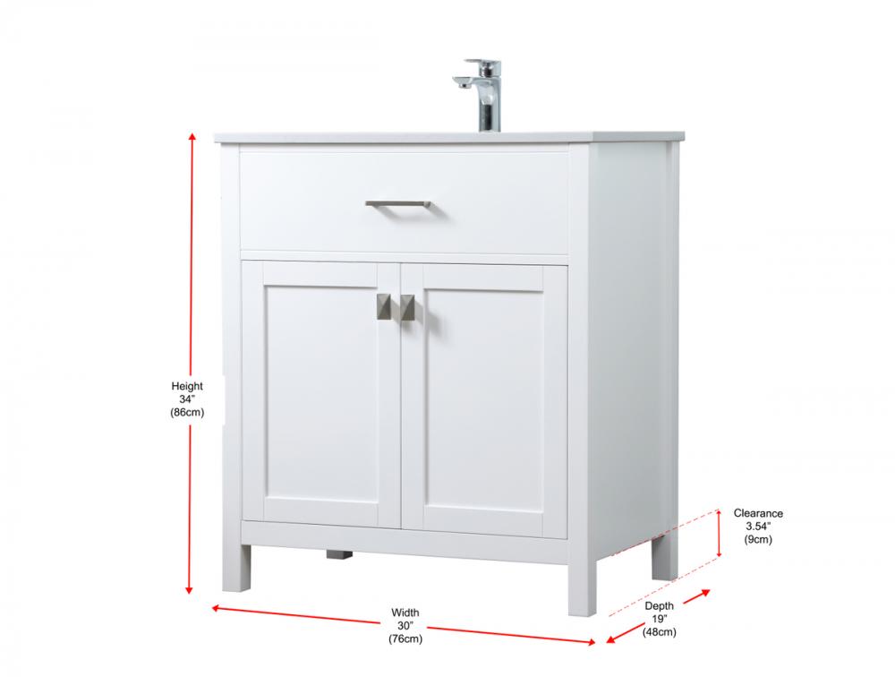 Elevate your bathroom aesthetic with our precision-crafted 30-inch vanity, featuring a chic straight edge cut and an engineered marble top that infuses a dash of modern elegance into your space. Designed for seamless access and ample storage, the vanity showcases a single functional cabinet with two soft close doors, paired with a faux top drawer. The sophisticated undermount porcelain sink seamlessly merges style with practicality, while the inclusion of stylish hardware adds a personalized touch and ensures convenient access to storage. Boasting a lower open shelf for additional storage, this vanity seamlessly blends functionality with style, providing a practical area for decor or essentials. Complete with a single pre-drilled hole for seamless faucet installation, our versatile vanity allows you to effortlessly personalize your bathroom, adding a final touch of elegance to your unique space. Redefine your bathroom experience with this stylish and functional addition.