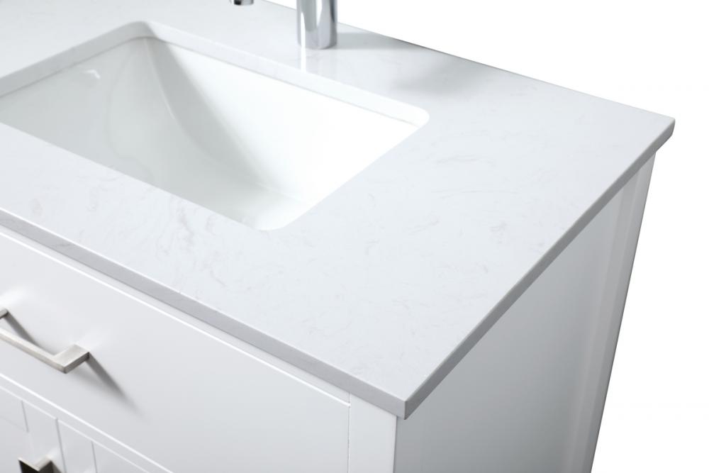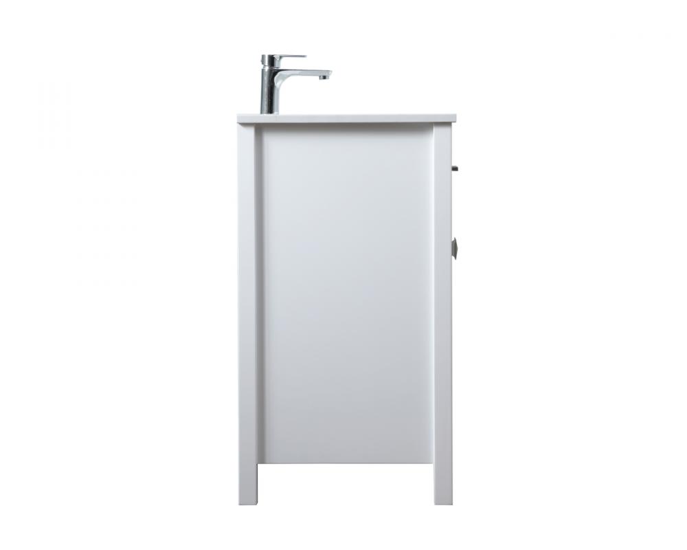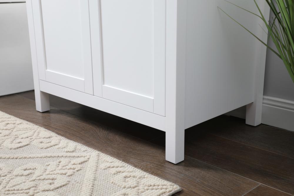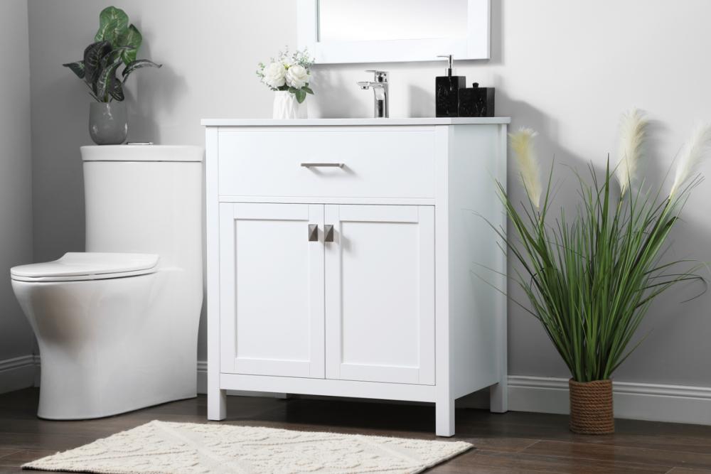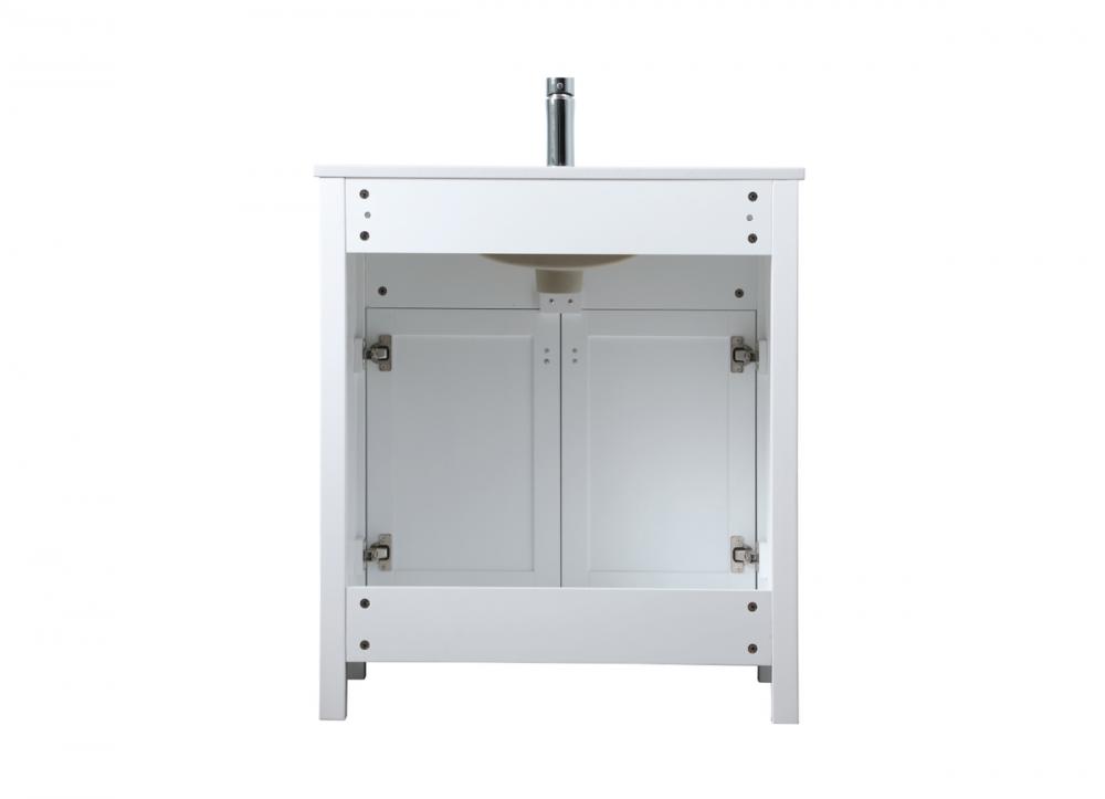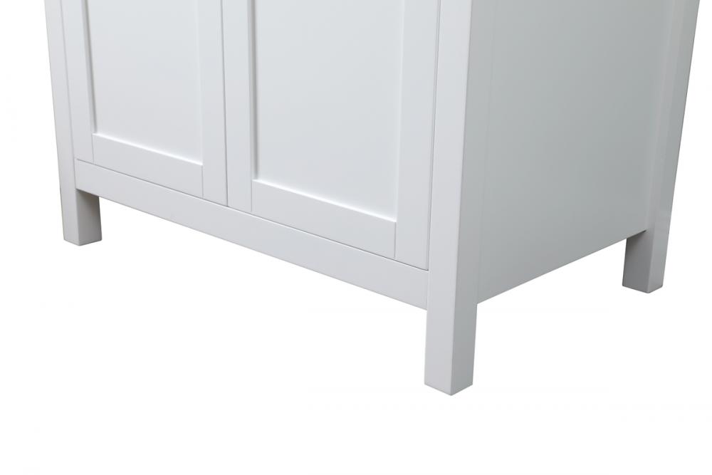 Elevate your bathroom aesthetic with our precision-crafted 30-inch vanity, featuring a chic straight edge cut and an engineered marble top that infuses a dash of modern elegance into your space. Designed for seamless access and ample storage, the vanity showcases a single functional cabinet with two soft close doors, paired with a faux top drawer. The sophisticated undermount porcelain sink seamlessly merges style with practicality, while the inclusion of stylish hardware adds a personalized touch and ensures convenient access to storage. Boasting a lower open shelf for additional storage, this vanity seamlessly blends functionality with style, providing a practical area for decor or essentials. Complete with a single pre-drilled hole for seamless faucet installation, our versatile vanity allows you to effortlessly personalize your bathroom, adding a final touch of elegance to your unique space. Redefine your bathroom experience with this stylish and functional addition.