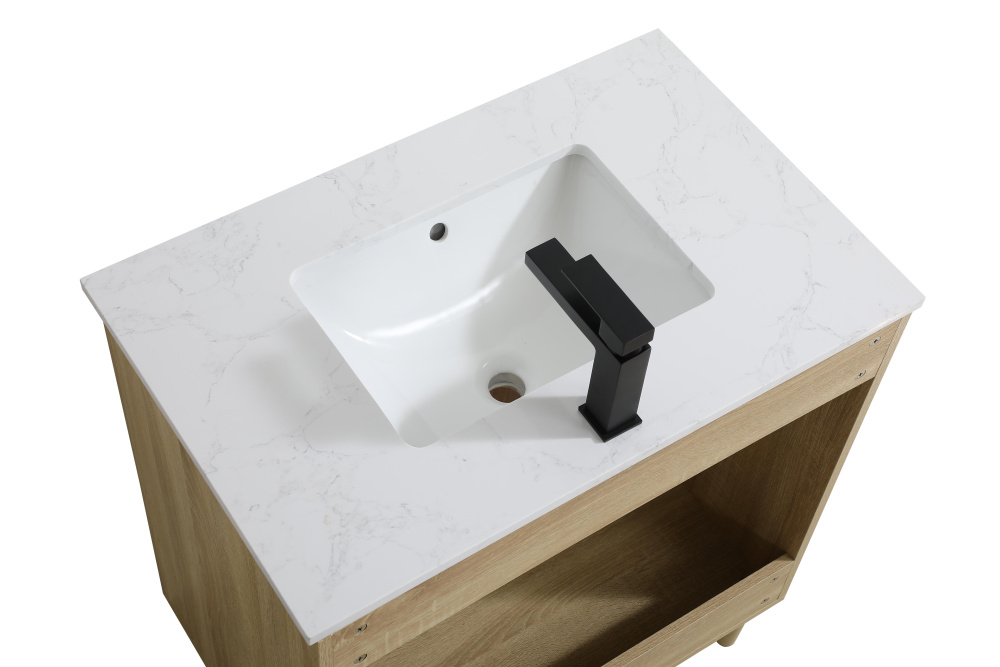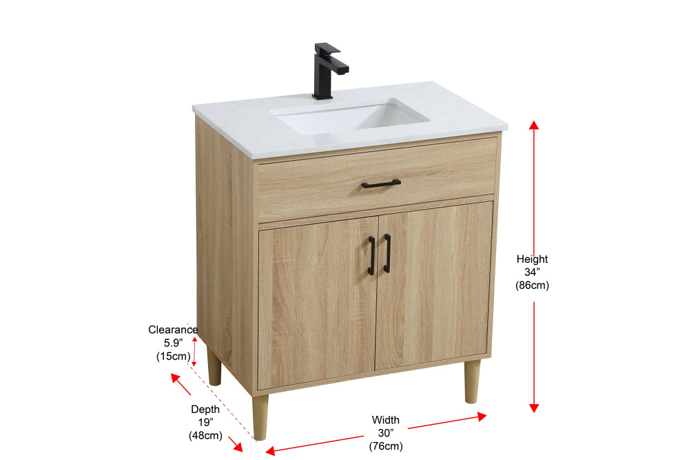 Transform your bathroom with this mid-century modern vanity, designed to bring both functionality and a sense of style to your space. Its clean lines, minimalist design, and tapered solid wood legs evoke a timeless charm, perfect for blending with modern and transitional interiors. The engineered marble countertop, with its unique faux marble veining, adds a refined, luxurious touch, while the porcelain sink is both durable and easy to maintain. Practicality meets aesthetics with a faux drawer for balanced design and a spacious double-door cabinet for efficient storage. Constructed from solid wood and MDF, this vanity offers lasting durability, while adjustable foot levelers ensure stability on any floor. Shipped mostly assembled, the solid wood legs can be effortlessly twisted into place, making installation quick and hassle-free.