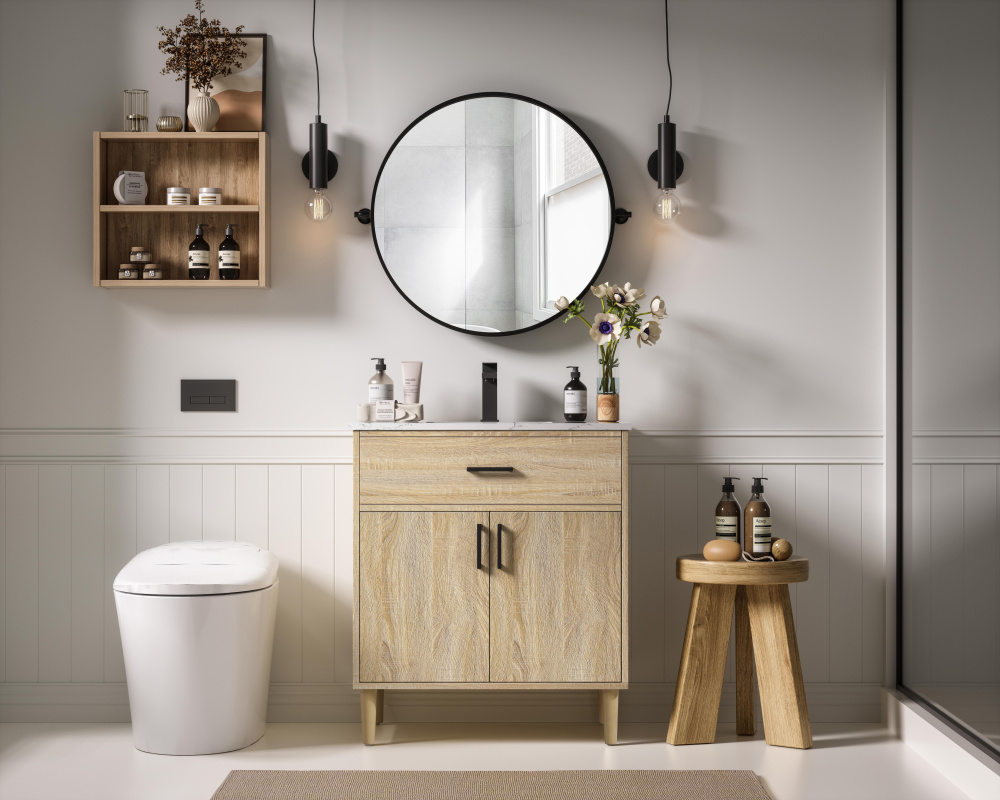 A natural wood-inspired finish adds warmth and texture to your bathroom.