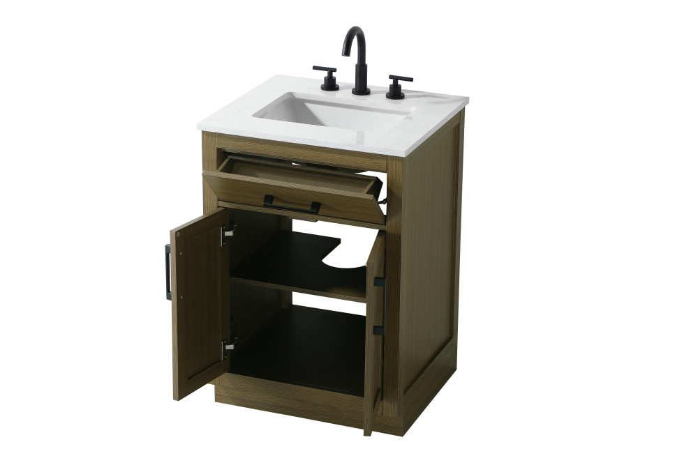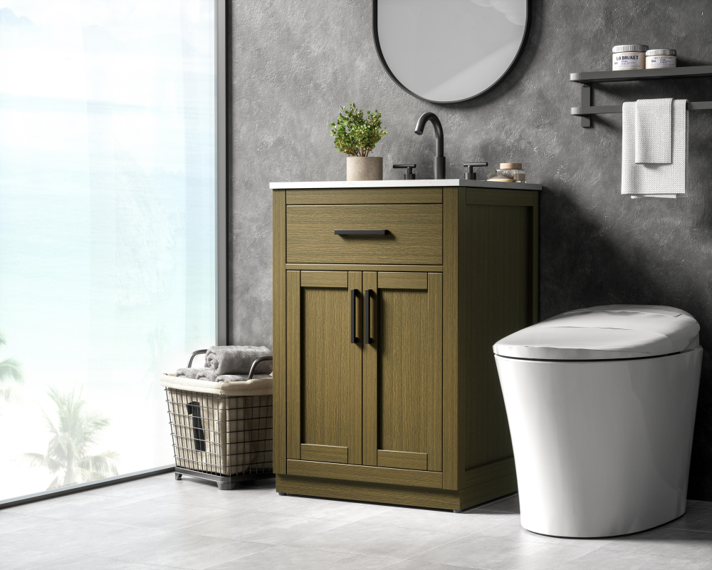 Introduce a perfect balance of functionality and style to your bathroom with this thoughtfully designed vanity. Constructed with a combination of solid wood and MDF, it offers durability and a sturdy build. The sleek engineered marble countertop with subtle grey marbling complements the rustic wood grain finish, creating a stylish and inviting centerpiece for your bathroom. Designed in a contemporary style with a transitional flair, it features a U-shaped shelf for seamless plumbing integration and multiple soft-close drawers for clutter-free organization. A pull-down drawer enhances convenience, while the toe kick adds a refined, clean-lined appearance and simplifies cleaning underneath. Matte black hardware contrasts beautifully with the cabinet finish, tying the look together. Delivered fully assembled and equipped with foot levelers, this vanity combines practicality and aesthetic appeal to suit modern and transitional bathrooms alike.