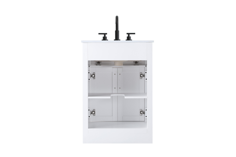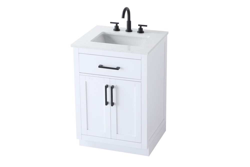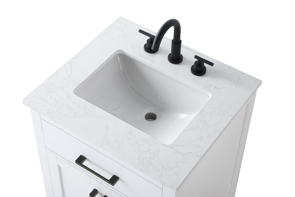 Engineered marble countertop with subtle grey marbling adds sophistication.