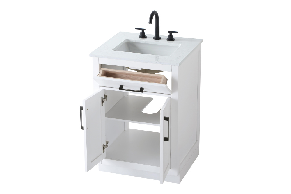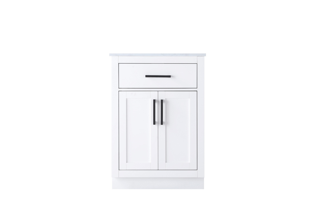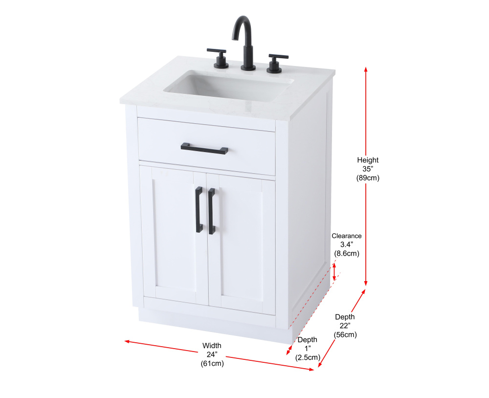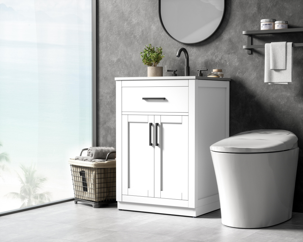 Introduce a perfect balance of functionality and style to your bathroom with this thoughtfully designed vanity. Constructed with a combination of solid wood and MDF, it offers durability and a sturdy build. The sleek engineered marble countertop with subtle grey marbling complements the rustic wood grain finish, creating a stylish and inviting centerpiece for your bathroom. Designed in a contemporary style with a transitional flair, it features a U-shaped shelf for seamless plumbing integration and multiple soft-close drawers for clutter-free organization. A pull-down drawer enhances convenience, while the toe kick adds a refined, clean-lined appearance and simplifies cleaning underneath. Matte black hardware contrasts beautifully with the cabinet finish, tying the look together. Delivered fully assembled and equipped with foot levelers, this vanity combines practicality and aesthetic appeal to suit modern and transitional bathrooms alike.