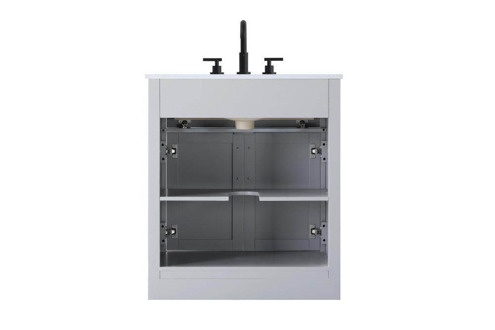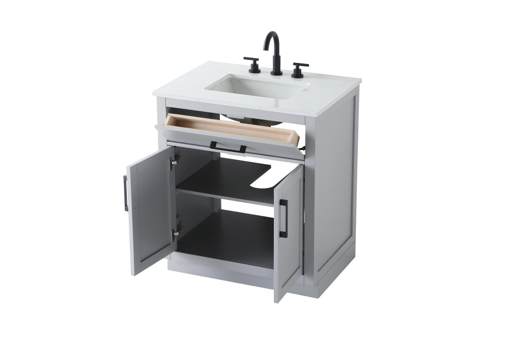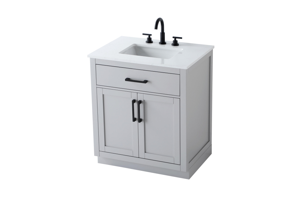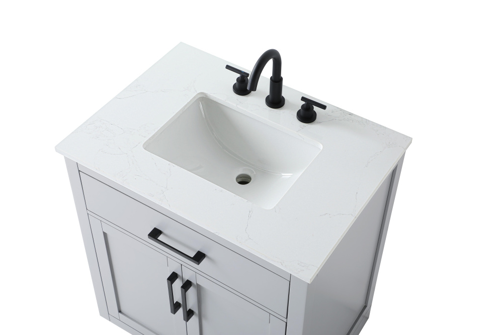 Engineered marble countertop with subtle grey marbling adds sophistication.