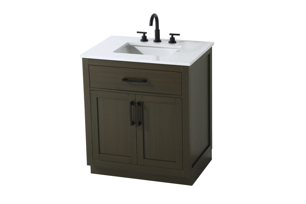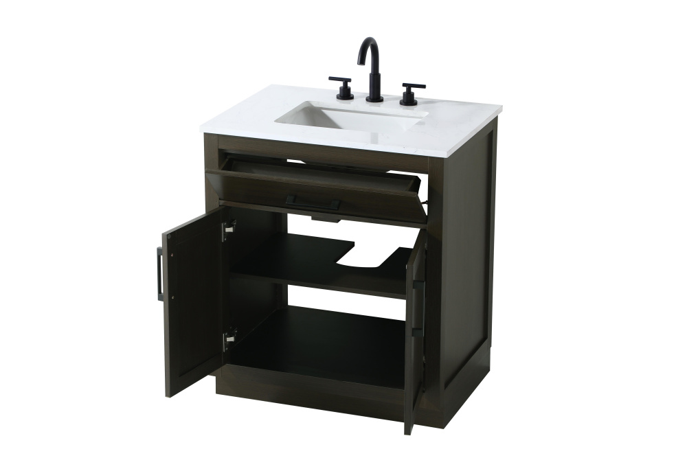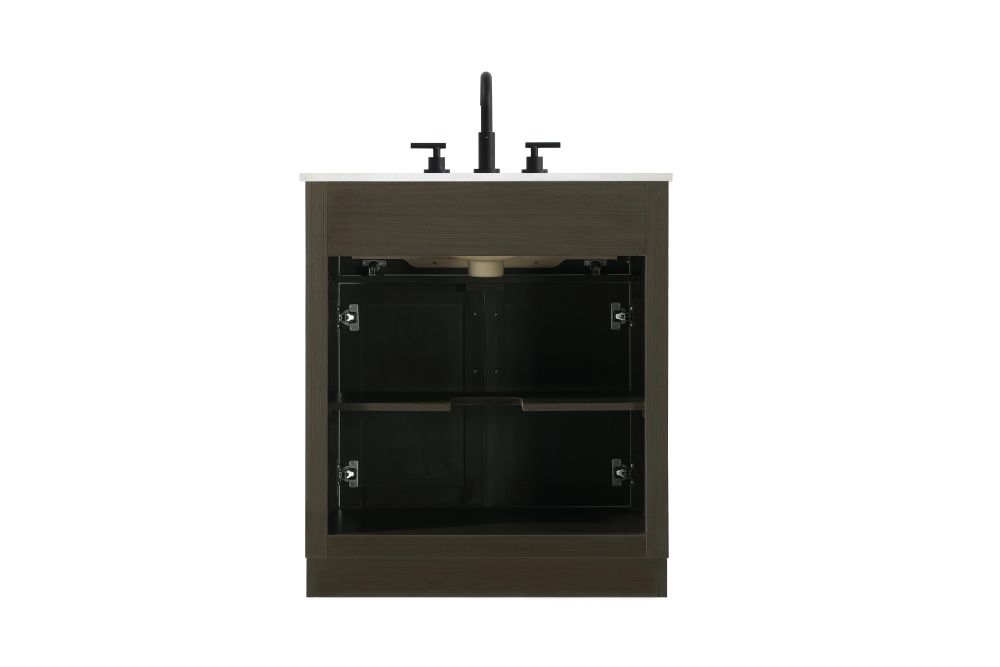 Introduce a perfect balance of functionality and style to your bathroom with this thoughtfully designed vanity. Constructed with a combination of solid wood and MDF, it offers durability and a sturdy build. The sleek engineered marble countertop with subtle grey marbling complements the rustic wood grain finish, creating a stylish and inviting centerpiece for your bathroom. Designed in a contemporary style with a transitional flair, it features a U-shaped shelf for seamless plumbing integration and multiple soft-close drawers for clutter-free organization. A pull-down drawer enhances convenience, while the toe kick adds a refined, clean-lined appearance and simplifies cleaning underneath. Matte black hardware contrasts beautifully with the cabinet finish, tying the look together. Delivered fully assembled and equipped with foot levelers, this vanity combines practicality and aesthetic appeal to suit modern and transitional bathrooms alike.
